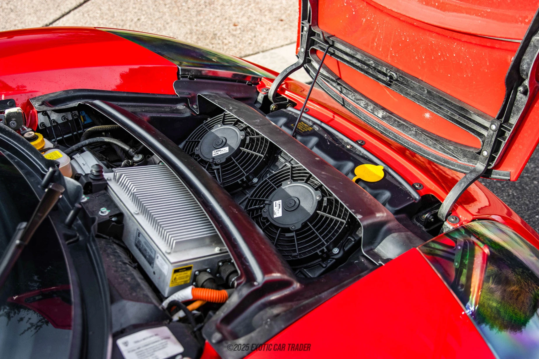 The Lotus Elise design is clearly visible on every Roadster, since Tesla didn’t go to change too much of what was already an eye-catching shape and form. They did, however, change elements such as the wheels, headlamp and taillamp clusters. However, those body panels are carbon fiber, which of course, aids in keeping vehicle weight down. The interior of this 2008 Tesla Roadster comes with two tan leather seats and is largely similar to the Elise. The only significant difference is the presence of two rather than three pedals in the driver’s footwell. However, closer inspection reveals more differentiation. For example, while the gauge cluster looks standard Elise, the rev counter runs up to 13,000rpm which is the motor’s maximum permissible speed. Then, there’s indicators for the car’s transmission, and the speedometer reaches 150mph. Looking at the upper center console, we find a JVC head unit with HDD navigation. Lower down are controls for the air conditioning and heating system, as well as two buttons for the seat heaters.