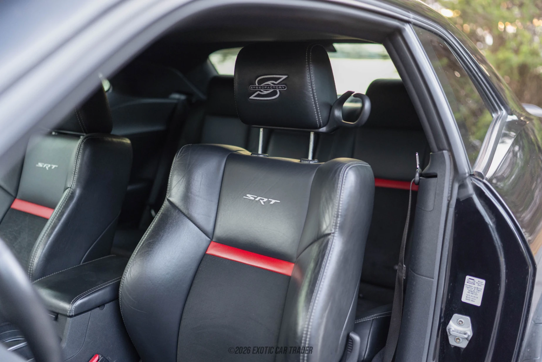 Finished in Brilliant Black Pearl, this Challenger maintains a clean and understated exterior that contrasts with its aggressive performance capabilities. Aftermarket wheels enhance its stance while preserving the classic wide-body muscle car proportions, and subtle SpeedFactory badging adds a custom touch without overwhelming the factory design. Inside, the Dark Slate Gray premium leather interior has been upgraded with SpeedFactory custom elements, including additional gauges for monitoring performance. The cabin retains key factory features such as a power sunroof and MyGIG multimedia system with navigation, blending comfort and convenience with a more purposeful, performance-oriented environment.