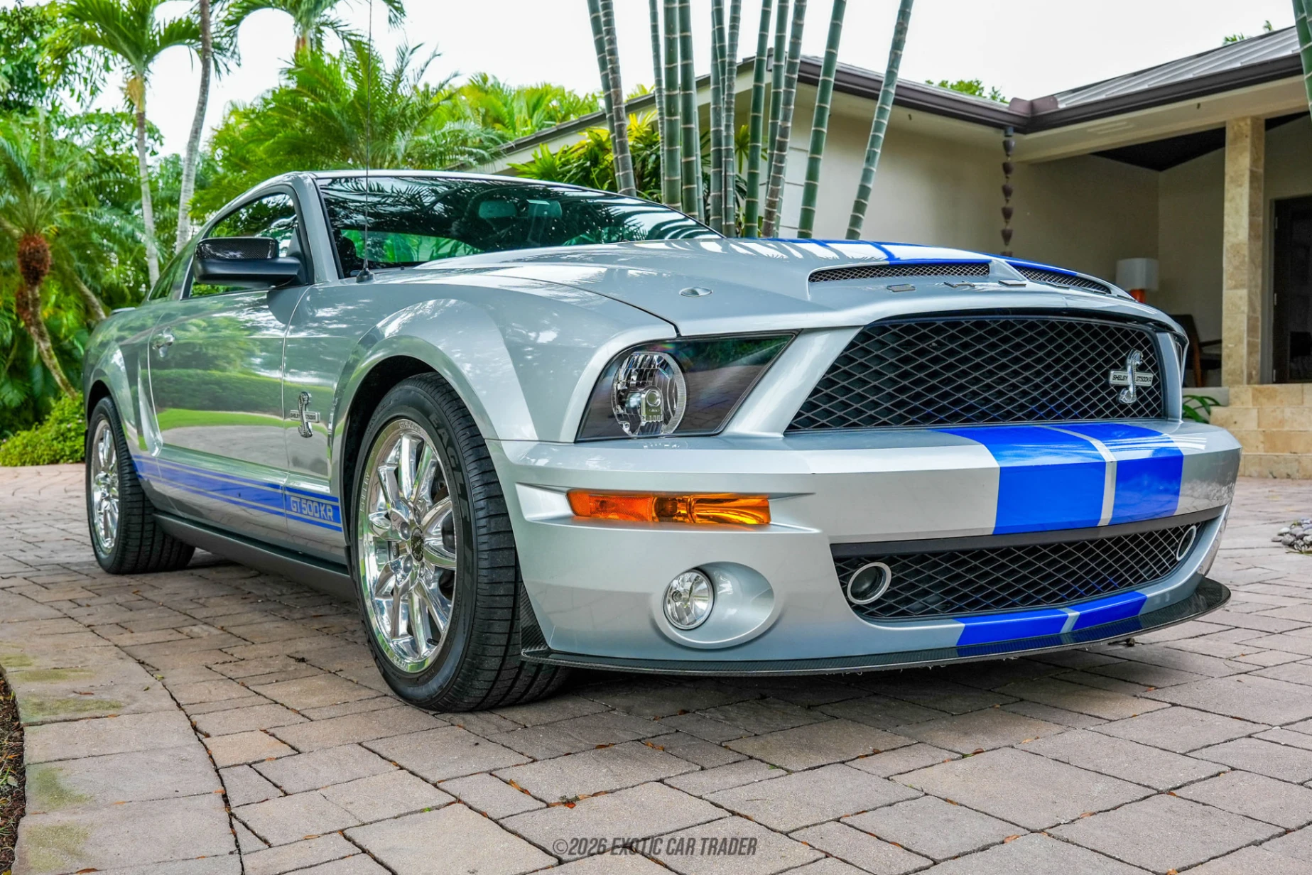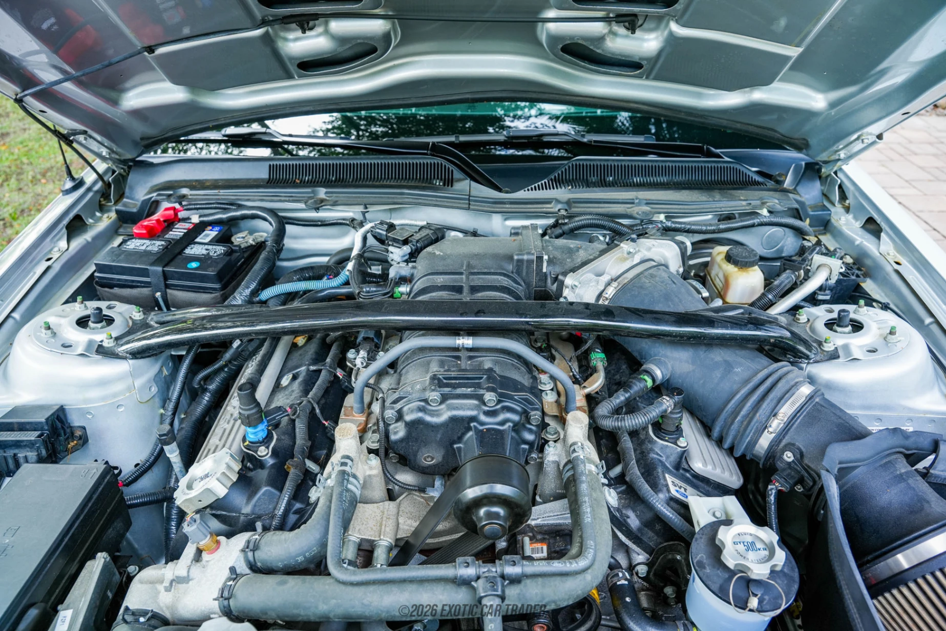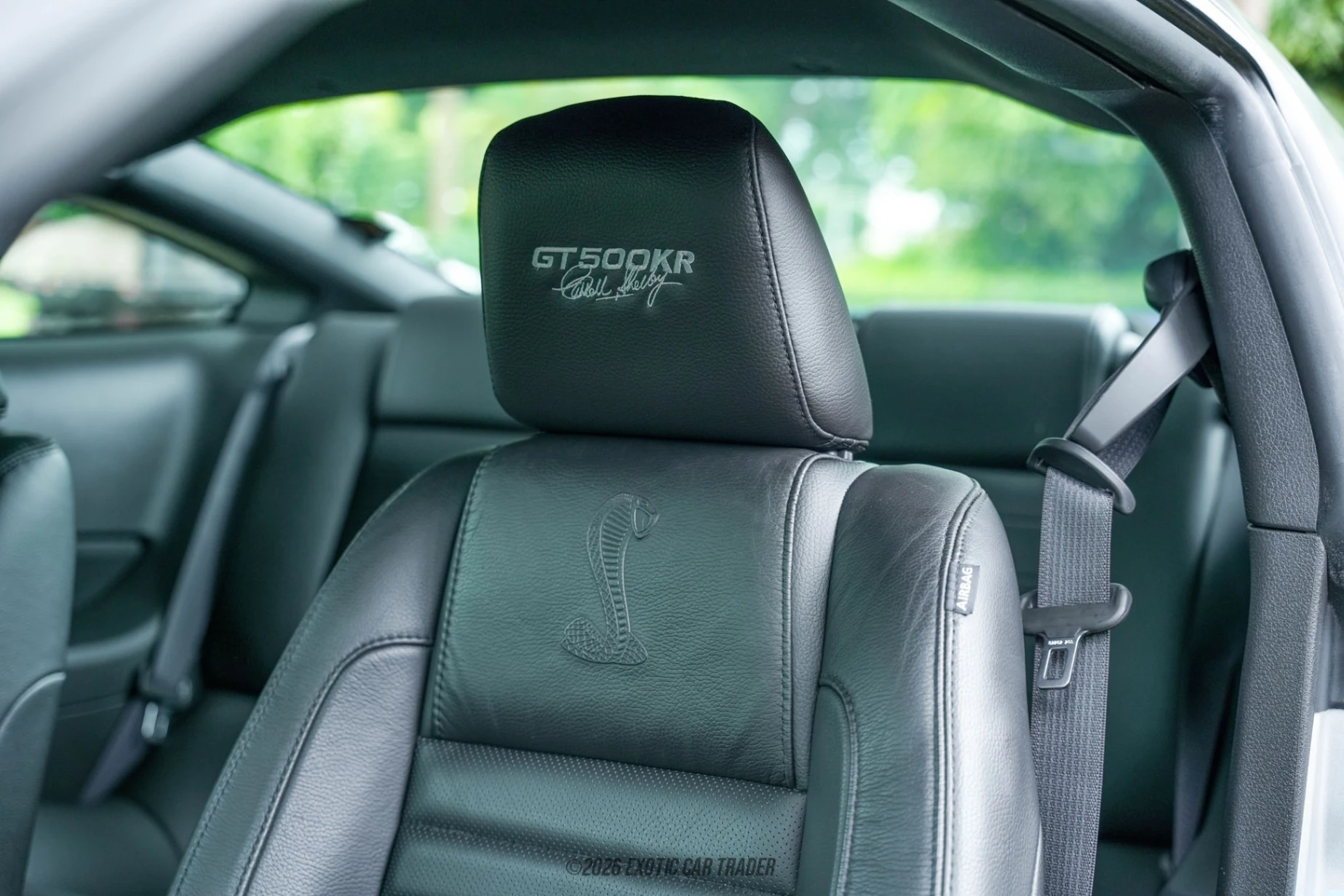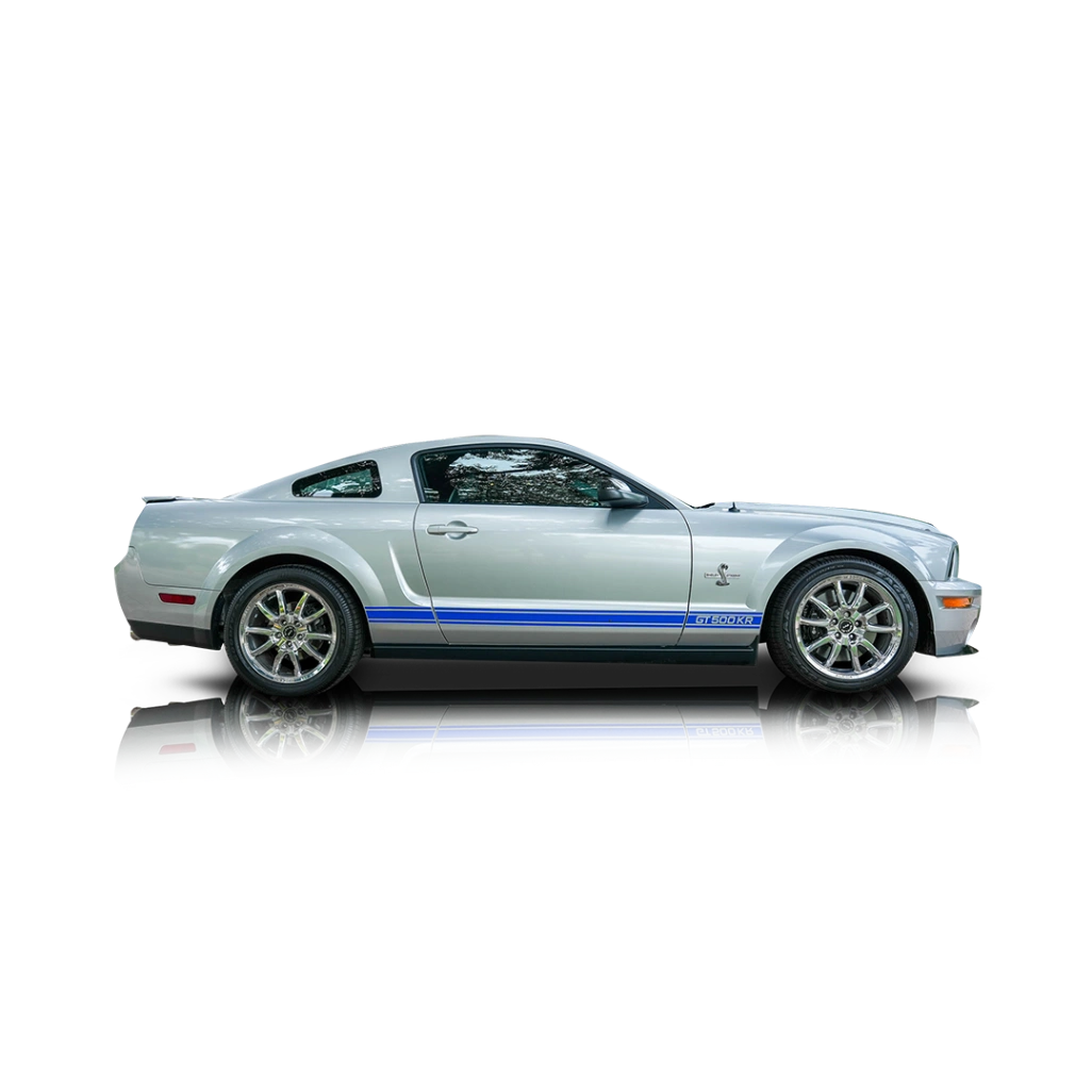 This 2009 Ford Mustang GT500KR Convertible comes in Vapor Silver Metallic, with a black power-operated convertible soft top to protect the passenger compartment when needed. The car is a menacing looker, make no mistake about it. The Shelby Racing dual over-the-top stripes are present in contrasting blue, and the 18-inch Shelby Alcoa forged aluminum wheels host high-performance tires. The hood contains sizable hood vents that are required to keep that V8 cool, and the Shelby Cobra motif stands proud on the front grille. You’ll also get a carbon fiber front and rear splitter as standard fitment. The Charcoal Black interior of this 2009 Ford Mustang GT500KR Convertible includes a numbered Shelby GT500KR interior plaque. It seats up to four adults on leather seats and offers the usual fifth-generation Mustang amenities. This includes air conditioning, a Shaker 1000 sound system with in-dash CD changer, AUX input and phone connectivity, and the usual powered amenities. Pop the trunk and the dual subwoofers occupy a little bit of space but it’s still pretty spacious.
