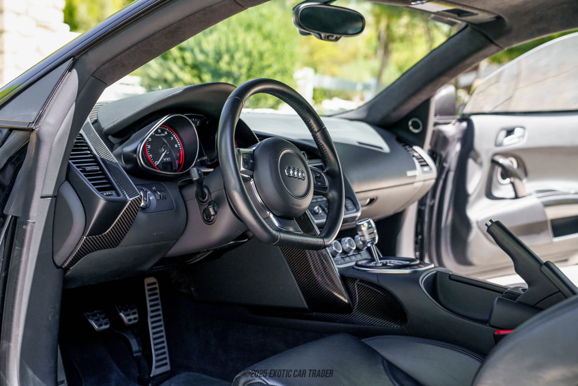 While the design of the R8 isn’t as flamboyant as its competitors from Italy, it’s very distinctive in a quiet, elegant way – especially in this Phantom Black Pearl paintwork with the 19” titanium finish alloy wheels. One of the most distinctive features of the R8 are its carbon fiber sideblades. This is a part of the Carbon Fiber Sigma package which also includes carbon fiber exterior mirrors and interior inlays. One of the lesser-known details of the R8’s design, however, is that it was the first car ever to use fully LED head lamps. The interior is black (with the Enhanced Leather package) with a black Alcantara headliner, and the sport seats are heated with 10-way power adjusters. The instrument cluster includes a voltage indicator gauge in addition to the standard fuel and engine temperature gauges. The tachometer redlines well above 8000rpm, and the speedometer goes up to 220mph, while an additional digital speed indicator sits between them. It has illuminated door sill inserts and well-balanced dashboard that combines dials, buttons and a digital infotainment screen. The main star of the show, however, is the silver gated shifter for the manual transmission.
