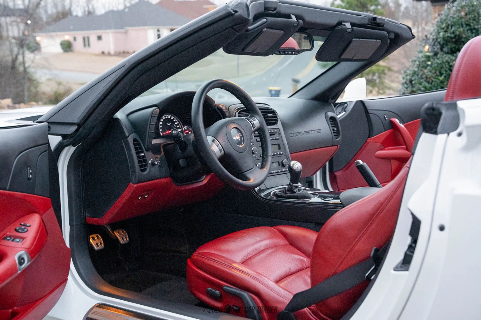 The Arctic White exterior highlights the Corvette’s sculpted bodywork and low-slung proportions, while the black soft top provides a classic contrast when raised. With the top down, the bold red leather interior becomes the centerpiece of the car, delivering a dramatic and unmistakably Corvette color combination. Equipped with the 2LT Preferred Equipment Group, the cabin offers premium features such as heated power seats, a head-up display, Bose premium audio, memory functions, and dual-zone climate control, all centered around a driver-focused cockpit designed for spirited driving.