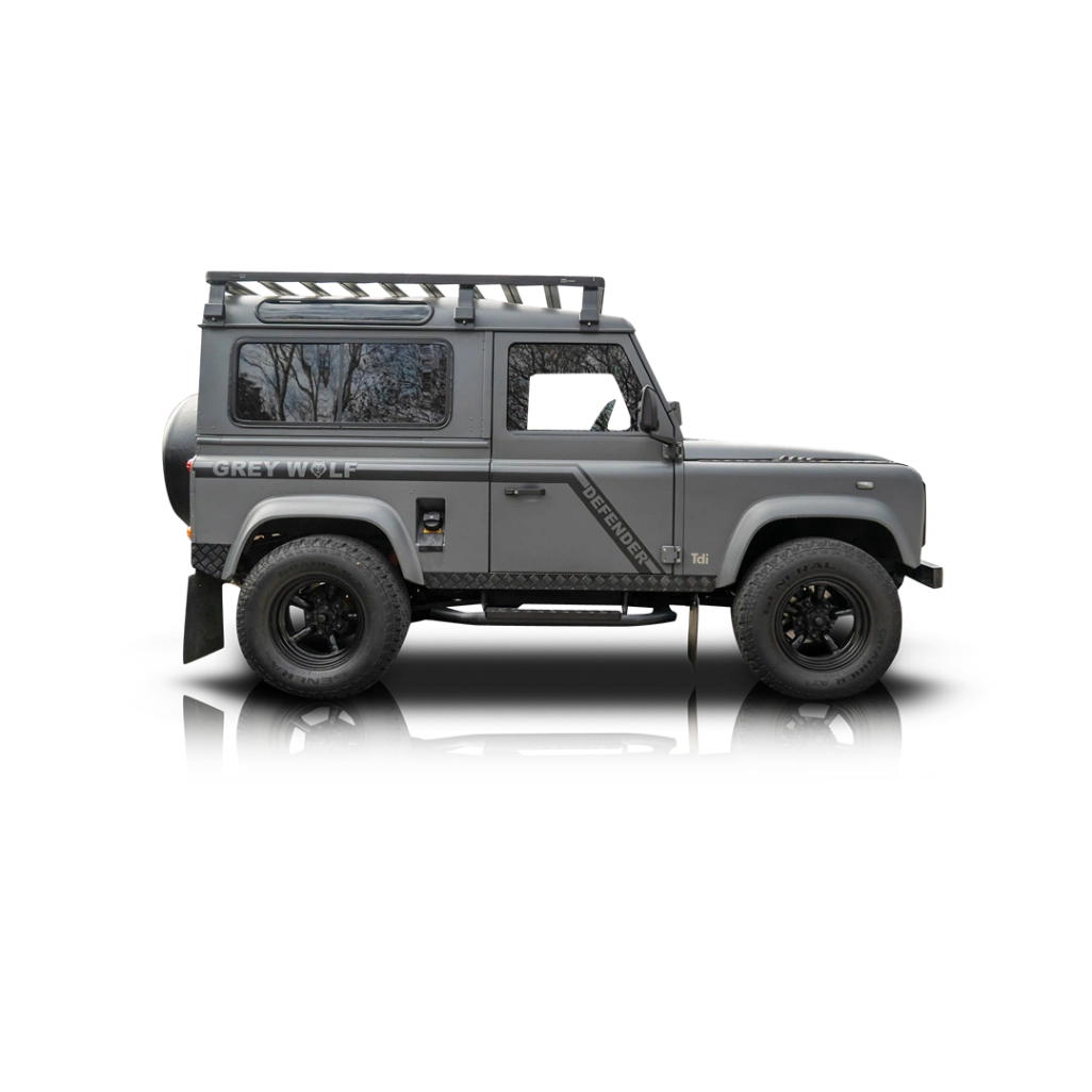 Finished in a striking matte gray, this Defender 90 commands attention with its black steel wheels wrapped in General Grabber all-terrain tires, a safari snorkel, and a full-length roof rack with a rear ladder. Additional exterior enhancements include a front bull bar, skid plate, diamond plate guards, fender flares, and side steps for easier access. Inside, the cabin is outfitted with black leather upholstery, a modern aftermarket stereo, cold A/C, and retains its spartan, functional dashboard layout—ideal for both urban and off-road use.