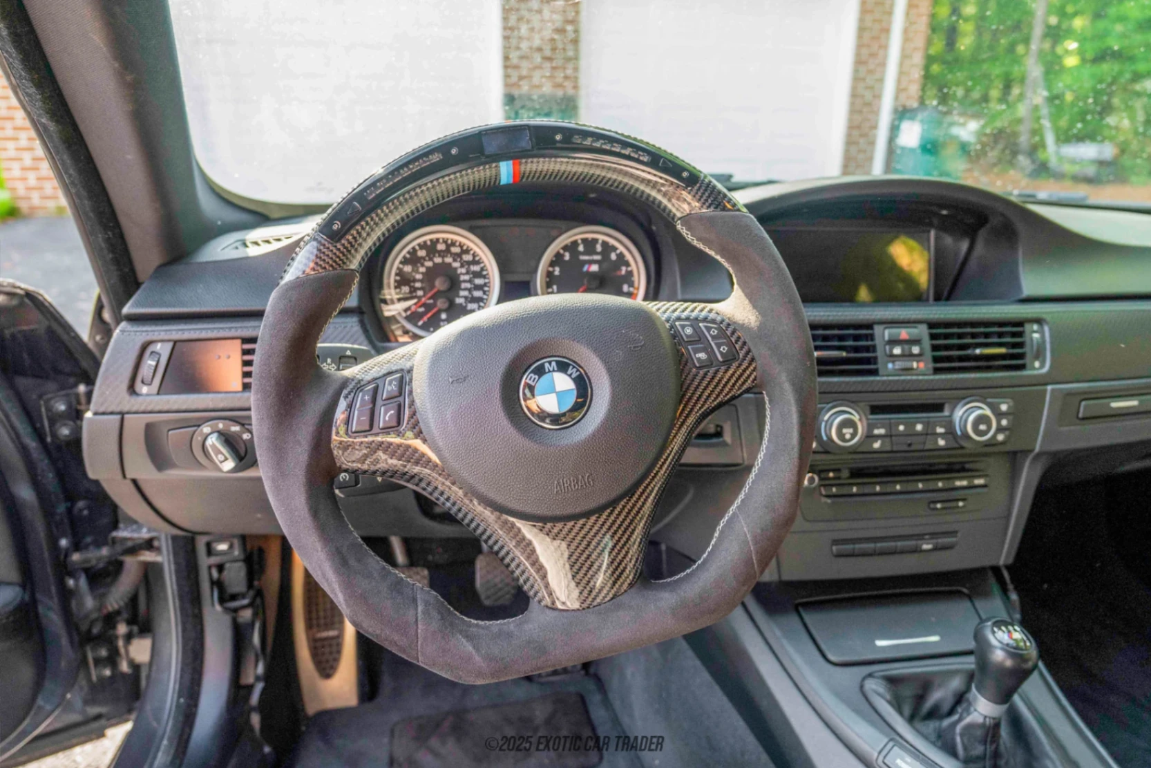 The coupe’s sleek body lines are finished in a sophisticated shade of Sophisto Gray Brilliant Metallic, which complements the car’s aggressive stance. The original factory bodywork remains intact, allowing the design to speak for itself without the need for flashy add-ons. Inside, the black leather interior remains in excellent condition, and the addition of a ZHP shift knob enhances tactile feedback for the driver. Additional upgrades like a Carbon Digital Cluster modernize the cockpit without compromising BMW’s timeless driver-focused layout.