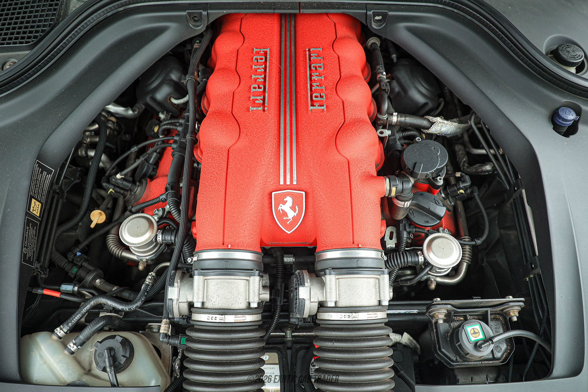 Designed by Pininfarina, you know that a Ferrari will be breathtakingly beautiful even before you cast eyes upon it. This 2012 Ferrari California is no different, with its red vinyl wrap giving it that signature Ferrari look. But if you don’t like red, you can simply remove the wrap to reveal the car’s Nero or black paintwork. The car’s wheels are also black, and it’s got a power-operated retractable hardtop that neatly stows into the trunk when lowered. Don’t worry, there’s still some cargo space available even with the roof stored here. The black interior of this 2012 Ferrari California has carbon fiber interior trim, a leather-wrapped steering wheel with paddle shifters, and a red face for the tachometer. The steering wheel also sports carbon inserts, and the pedals are drilled metal sport units. The car also has a touchscreen infotainment system, as well as automatic climate control with air conditioning for your comfort.