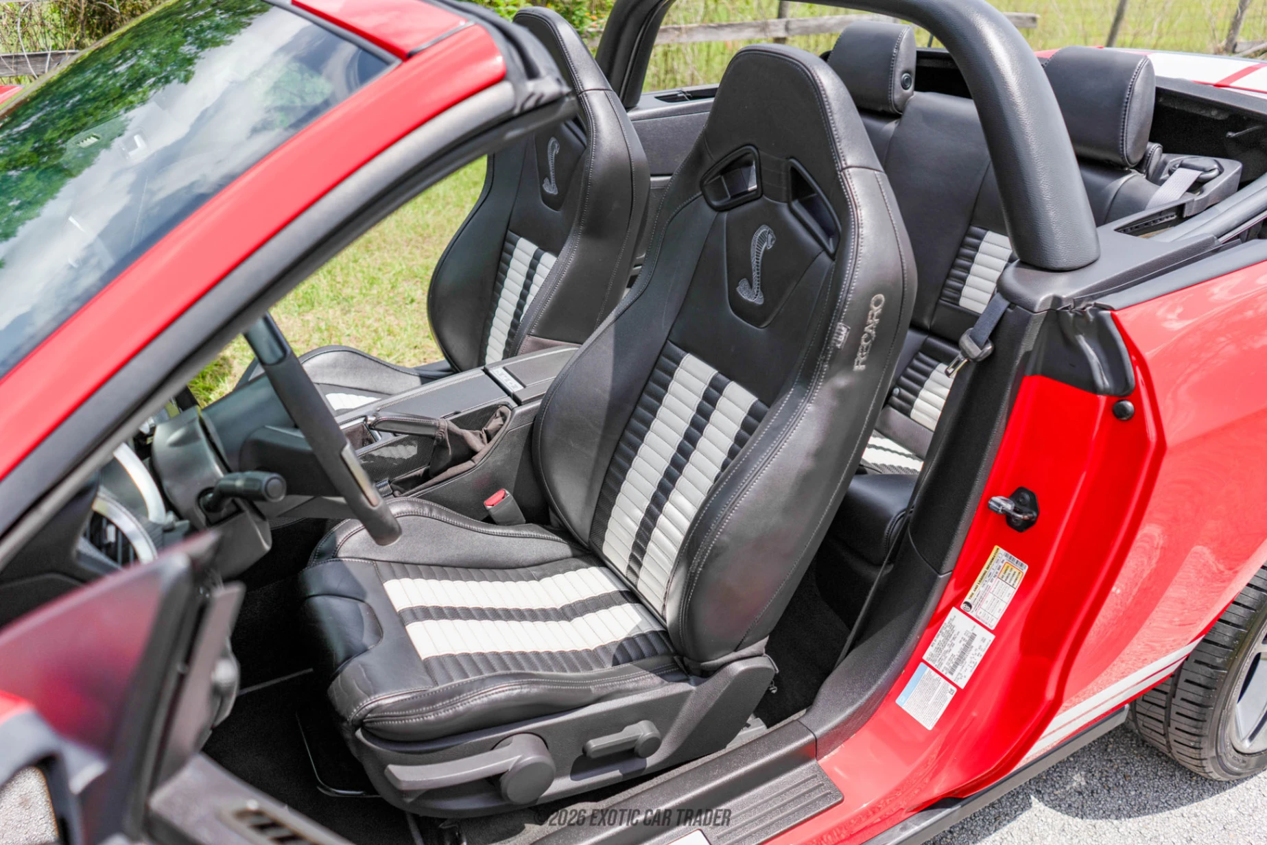 The exterior of this 2012 Ford Mustang Shelby GT500 Convertible is finished in Race Red and immediately commands attention with its aggressive stance and signature Shelby striping. The aluminum hood with functional air extractor not only enhances cooling but adds to the car’s purposeful design. Staggered 19-inch front and 20-inch rear painted aluminum wheels fill the arches perfectly, while Brembo brakes hint at the performance capability beneath. The black convertible soft top provides a clean contrast and allows for open-air cruising at a moment’s notice, making this car equally suited for spirited drives and relaxed weekend outings. The interior of this 2012 Ford Mustang Shelby GT500 Convertible features black leather sport bucket seats with unique racing stripe inserts, reinforcing its performance identity. The cabin blends muscle car attitude with modern convenience, offering the Shaker 500 audio system and Ford’s SYNC voice-activated interface. The Electronics Package adds navigation, making longer drives more enjoyable and practical. Despite its performance focus, the GT500 provides a comfortable and driver-focused cockpit, ensuring that every drive feels engaging without sacrificing usability.