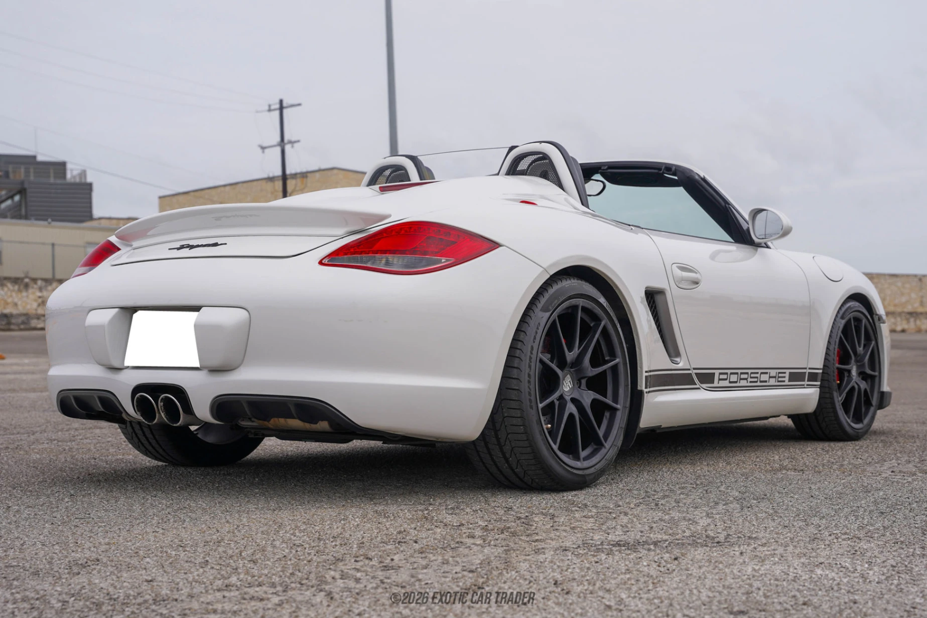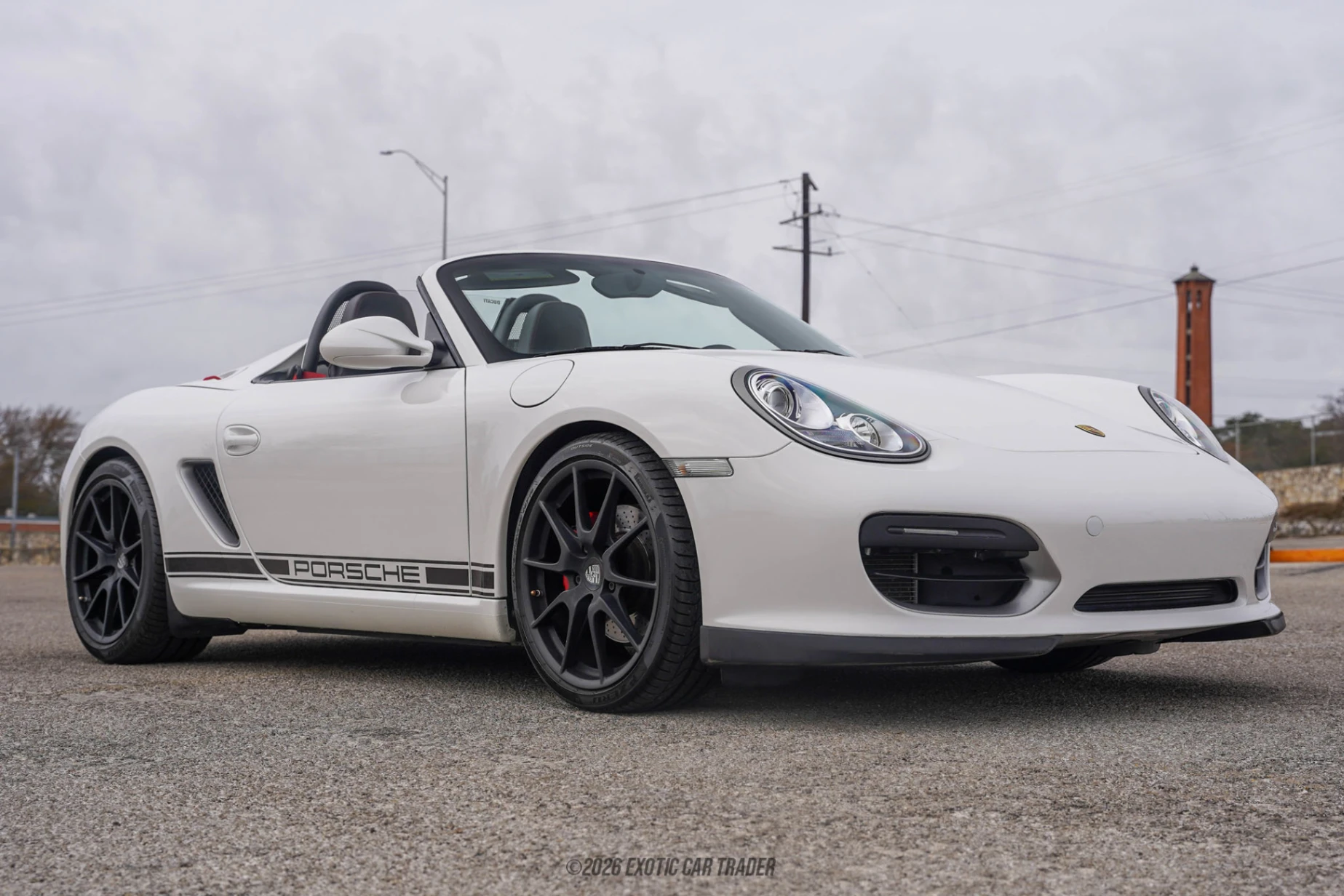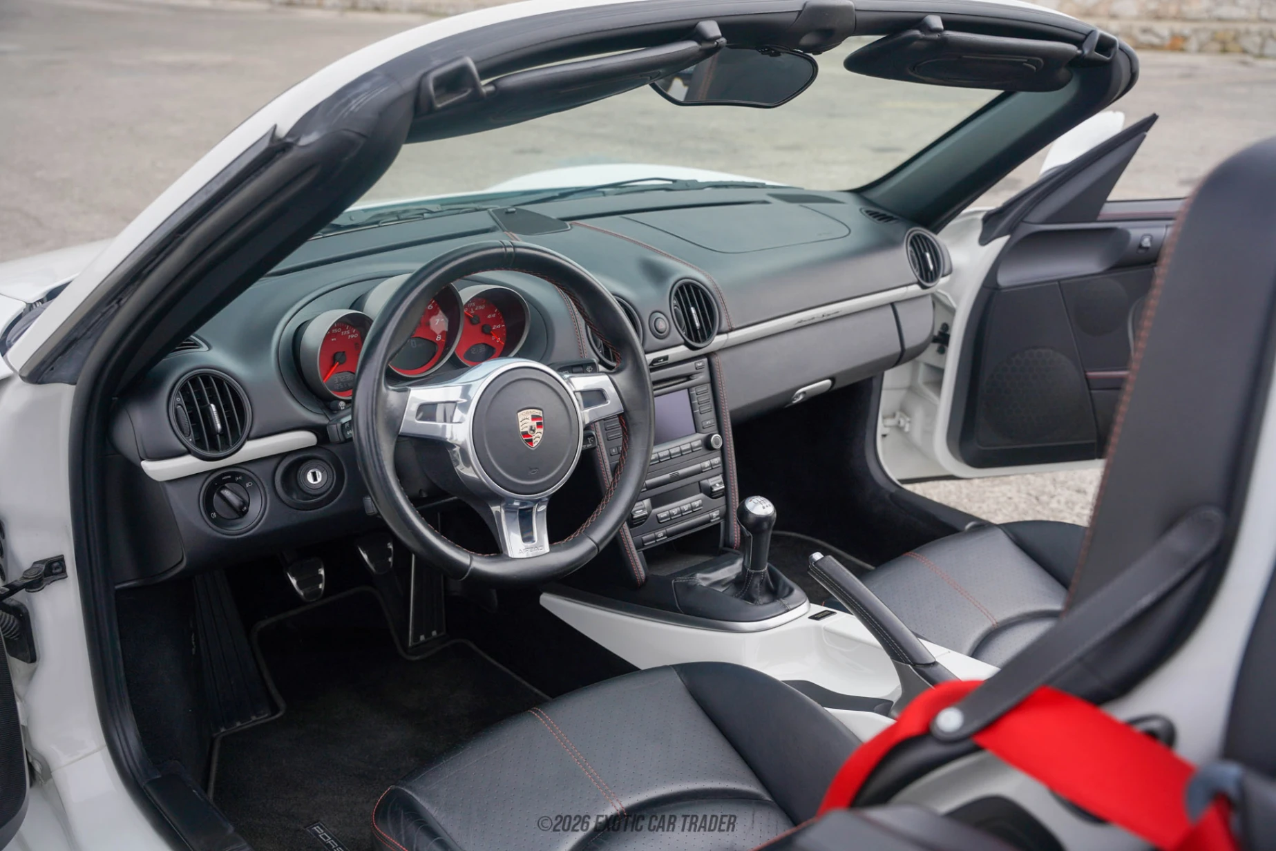 This 2012 Porsche Boxster comes to you in clean white, capping things off with a black power-operated convertible top. Its 19-inch wheels come in contrasting black, with red brake calipers for a splash of color. The profile of the car is unmistakably Porsche, while the black Porsche decals and colored Porsche crests further drive the point home. The two-seat interior of this 2012 Porsche Boxster comes with sport bucket seats, climate control, and a full infotainment system. It’s got a red-faced gauge cluster within a three dial binnacle, and is a wonderful place to spend hours and hours in. There’s surprisingly decent space for a compact two-seater, while features such as red door pulls add some sportiness here and there.