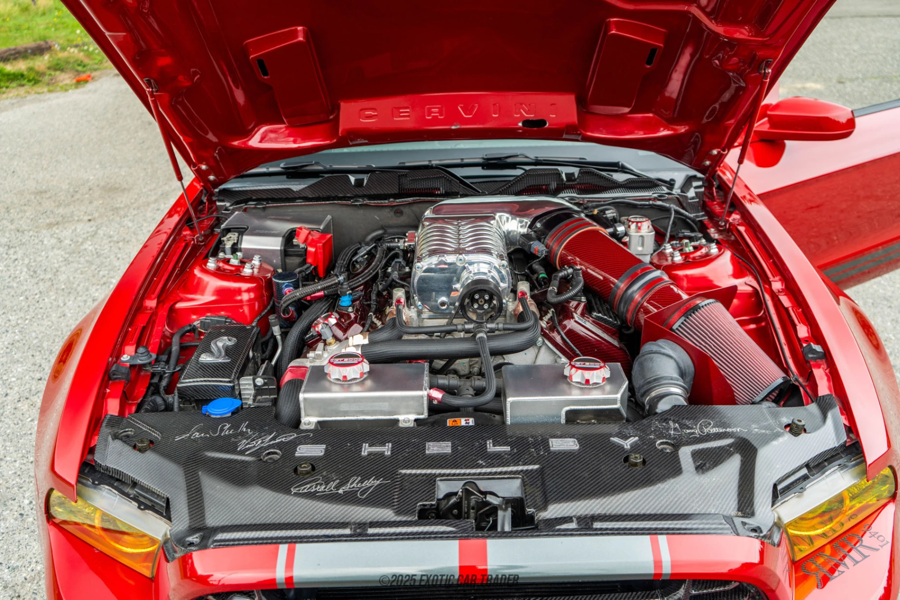 Red Candy Metallic is one of the go-to colors for the Ford Mustang Shelby, and each time, it does not disappoint. This sexy exterior is adorned with over-the-top black Shelby Stripes and side stripes. These beautiful black accents are complemented by carbon fiber side skirts, front lip, and rear diffuser. This Shelby enjoys a Cirvini Ram Air Hood that adds more aggression to its look, while the whole exterior is protected with Opti-Coat & 3M paint protection film. Shelby American "Venice" wheels carry the car, and with their black, red, and white color combo, they look great while doing so. The convertible boot cover and black cloth convertible roof are stock options. As you step inside this 2013 Ford Mustang Shelby GT500 Convertible, you’ll be greeted with a Charcoal Black interior with Crocodile & Alcantara Suede accents. You get the Equipment Group 821A and electronics package with navigation as stock options.