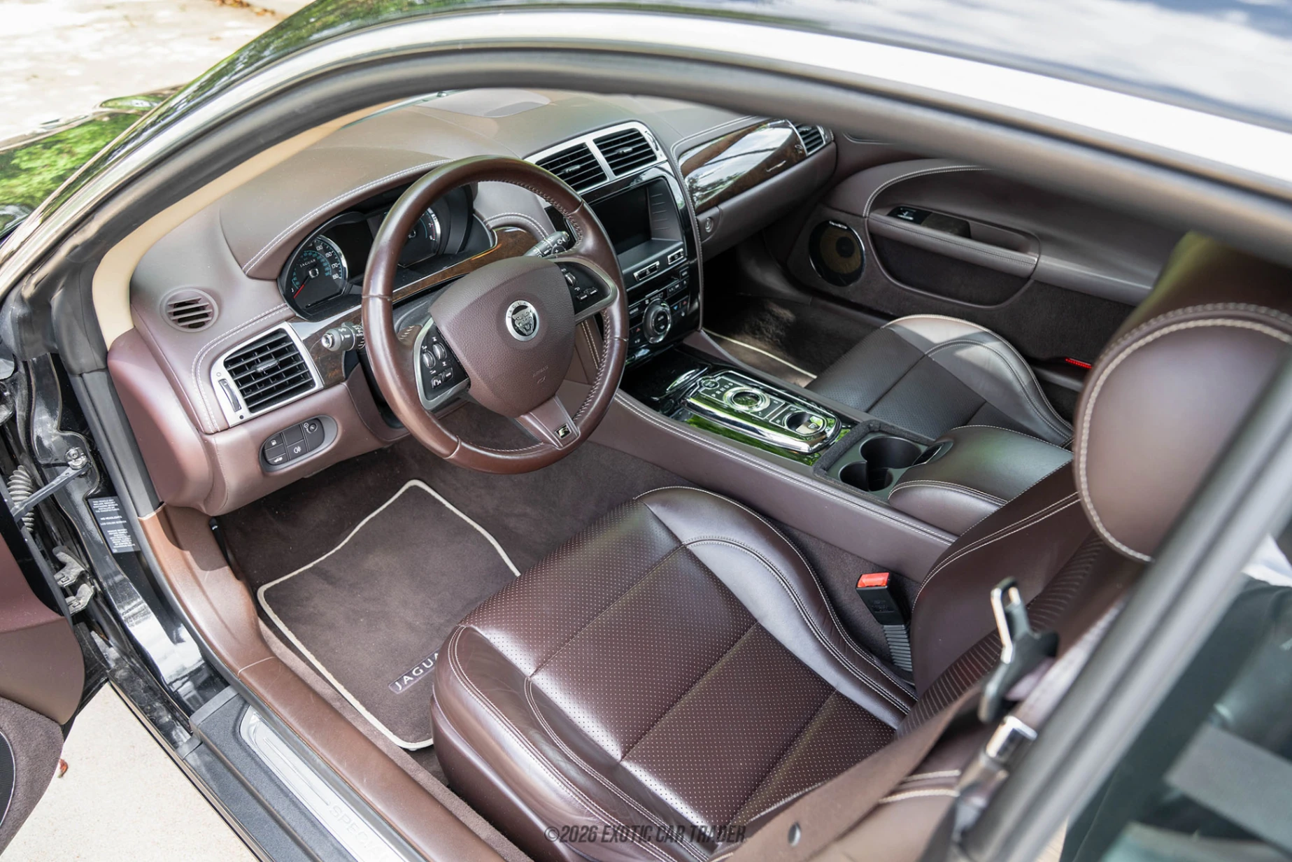 The exterior of this 2013 Jaguar XKR Coupe is finished in Ultimate Black, a deep and refined shade that highlights the car’s sleek, flowing body lines. The addition of the Portfolio Pack elevates its presence with chrome accents including a bright grille and mirror caps, giving the car a more distinguished and upscale appearance. Sitting on 20-inch polished Orona wheels, the XKR maintains a perfect balance between sporty aggression and executive elegance. Subtle performance cues such as the quad exhaust outlets hint at the power beneath, while maintaining the car’s refined aesthetic. The interior of this 2013 Jaguar XKR Coupe is a showcase of craftsmanship and luxury. Upholstered in Truffle and Ivory leather, the cabin features the exclusive Portfolio interior theme, complemented by a Poltrona Frau leather headliner that adds a bespoke touch rarely seen in this segment. Door sill treadplates and fine detailing throughout reinforce the premium feel. The cabin is designed to cocoon occupants in comfort while still providing a driver-focused layout, blending traditional Jaguar luxury with modern technology and performance-oriented ergonomics.