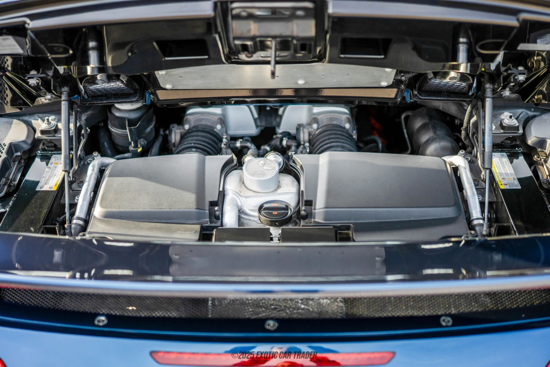 The original paintwork of this 2014 Audi R8 5.2 Quattro Spyder is Phantom Black Pearl, but its coated with the aforementioned Midnight Blue vinyl wrap for a stunning effect. The car’s BBS aluminum wheels are also attractive, making this R8 look suitably distinctive from its brethren, and since it’s a convertible, you have a power-operated black soft top to deploy at will. There are Carbon Sigma decorative inlays and a full carbon fiber wing too. The two-seat interior of this 2014 Audi R8 5.2 Quattro Spyder comes with black fine Nappa leather upholstery that features diamond stitching as well. The car comes with a lovely analog gauge cluster that includes a 10,000rpm tachometer and a 220mph speedometer. You also have automatic climate control with air conditioning, a touchscreen Audi Navigation Plus infotainment system, a premium speaker system, and a multifunction steering wheel. The gear shifting paddles live here as well.
