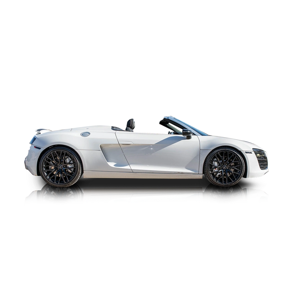 Finished in Ibis White with a black fabric soft top, the exterior specification presents a clean and understated contrast that highlights the R8’s low-slung proportions and mid-engine layout. The Audi exclusive Black Optic package adds black exterior accents and black exhaust finishers, subtly sharpening the overall appearance. Factory 19-inch 5-double-spoke wheels in titanium finish complete the exterior configuration. The interior is trimmed in black leather with red contrast stitching and is further enhanced by the full Fine Nappa leather package, which extends premium leather across the seating surfaces and interior touchpoints. Carbon Sigma decorative inlays add a technical aesthetic to the cabin, while illuminated aluminum door sills reinforce the car’s premium positioning. Audi navigation plus with MMI logic and the Bang & Olufsen sound system provide modern infotainment and audio performance consistent with the R8’s luxury-focused design intent.