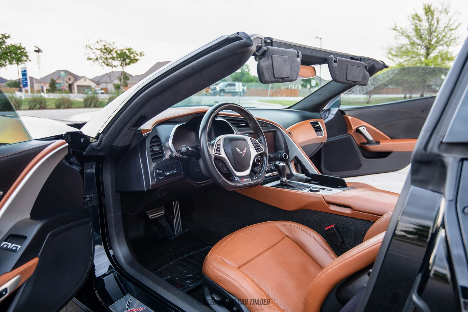 This 2016 Chevrolet Corvette Z06 comes in Matte Black because it doesn’t need a bright color to stand out. Instead, the car’s chiseled and menacing looks, hunkered-down stance and black alloy wheels with yellow brake calipers do the necessary introductions. The paint is protected via a paint protection film, we’re told. At the rear, a quartet of silver exhaust pipes allows the engine to make the most ethereal noises you’ll have heard from a modern car, while the rear spoiler adds further sportiness to what is already a pretty potent appearance package. You’ve also got a color-matched roof panel, as well as a glass top. The Saddle Brown interior of this 2016 Chevrolet Corvette Z06 is highly specified, since this is an LT3 trim variant. It’s got power-adjustable seats with heating and cooling, a Bose speaker system, a multifunction steering wheel, dual-zone automatic climate control with air conditioning, smartphone integration, and more. There’s a decent amount of cargo space in the trunk as well.