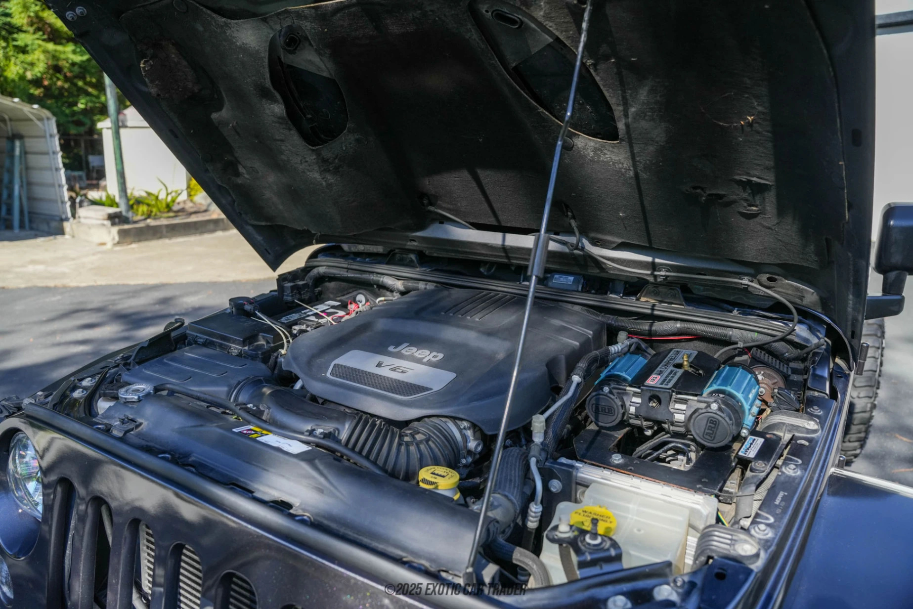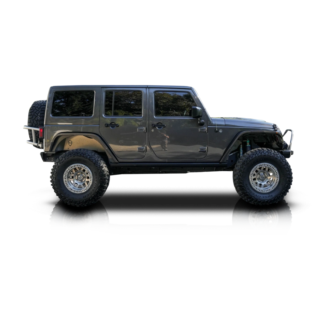 This 2016 Jeep Wrangler Unlimited Rubicon boasts an attractive dark gray paint. The front end features a JCR front bumper integrated with a SmittyBuilt X20 Winch, paired with custom paint-matched metal fenders, Evo Manufacturing front mini fender liners, and JCR rear fender liners for both style and function. Additional upgrades include rock sliders, rock lights for nighttime trails, and a JCR rear bumper with a swing-away tire carrier holding a full-size spare. Thanks to an Evo Manufacturing 4.5” Heavy Duty Wrangler Enforcer Lift Kit, this Wrangler provides extra clearance for the massive 37” Cooper Discoverer tires mounted on 17”x12” KMC Beadlock Wheels. Inside, the Wrangler maintains its utilitarian roots with brown leather Rubicon-embroidered seats. A driver-side under-seat lockbox provides discreet storage for valuables. It also features CB radio integration that allows short-distance one-to-many bidirectional voice communication, which comes in handy during expeditions.