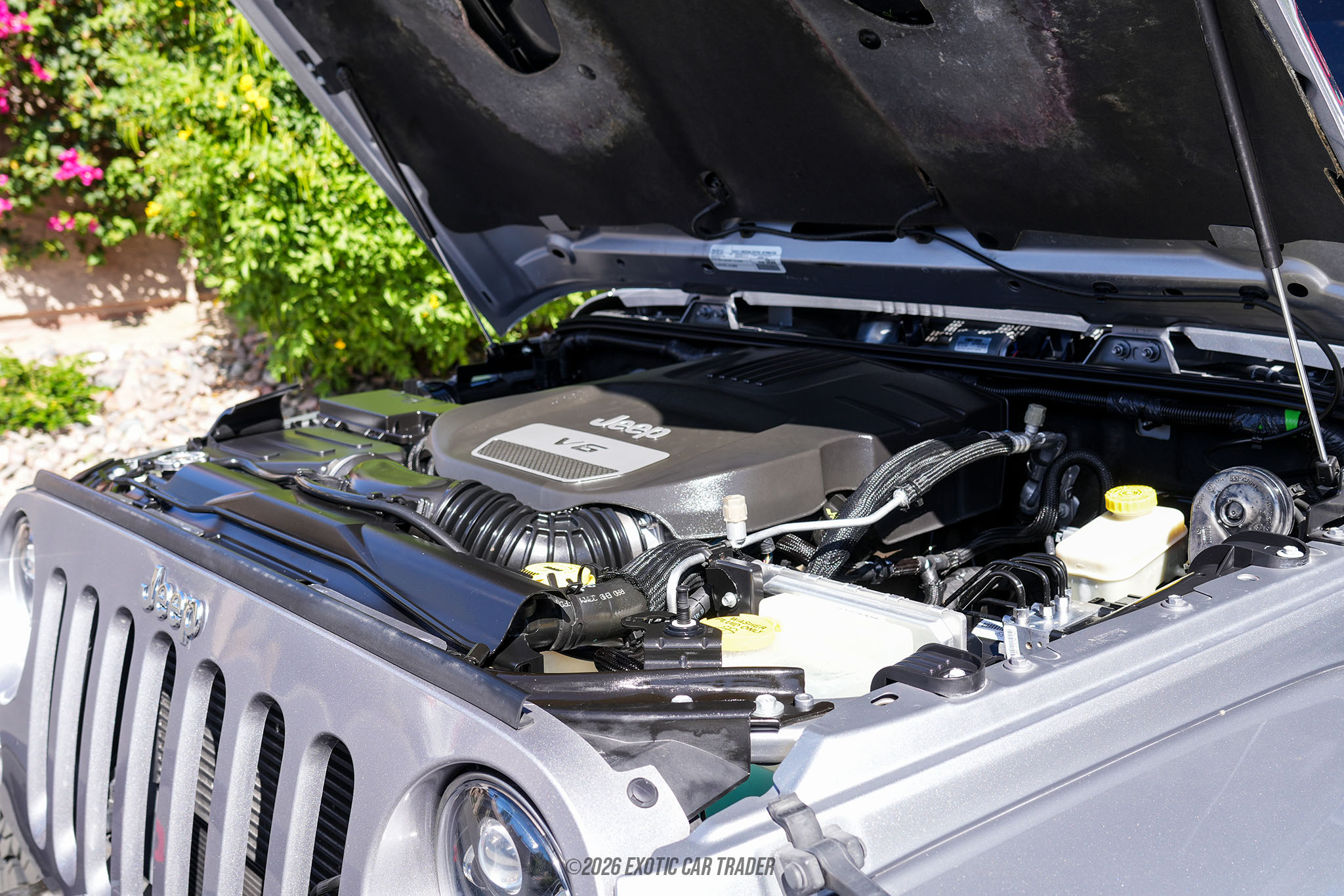 Powering this Wrangler is a 3.6L Pentastar V6 engine paired with either a manual or automatic transmission, delivering reliable performance and strong low-end torque. The Rubicon’s Rock-Trac 4x4 system, along with electronic locking front and rear differentials and a disconnecting front sway bar, allows it to tackle challenging terrain with confidence. Heavy-duty axles and off-road suspension components further enhance its capability, making it one of the most trail-ready vehicles available from the factory.