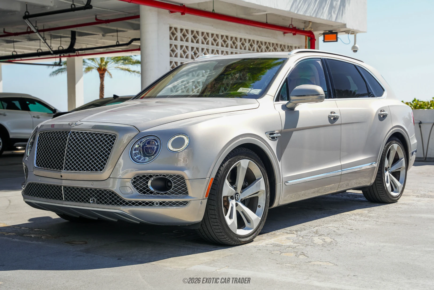 Finished in Silverlake Metallic, the exterior of this 2017 Bentley Bentayga presents a refined, understated metallic tone that highlights the Bentayga’s sculpted body lines and classic Bentley design cues. Factory 21-inch alloy wheels and signature matrix grille complete the elegant yet commanding presence. Inside, the cabin is upholstered in Portland leather as the primary color, contrasted by Damson leather accents along the seat bases, lower panels, and rear console. Diamond-quilted seating, premium veneers, and rear entertainment screens emphasize the Bentayga’s bespoke luxury character and long-distance comfort focus.