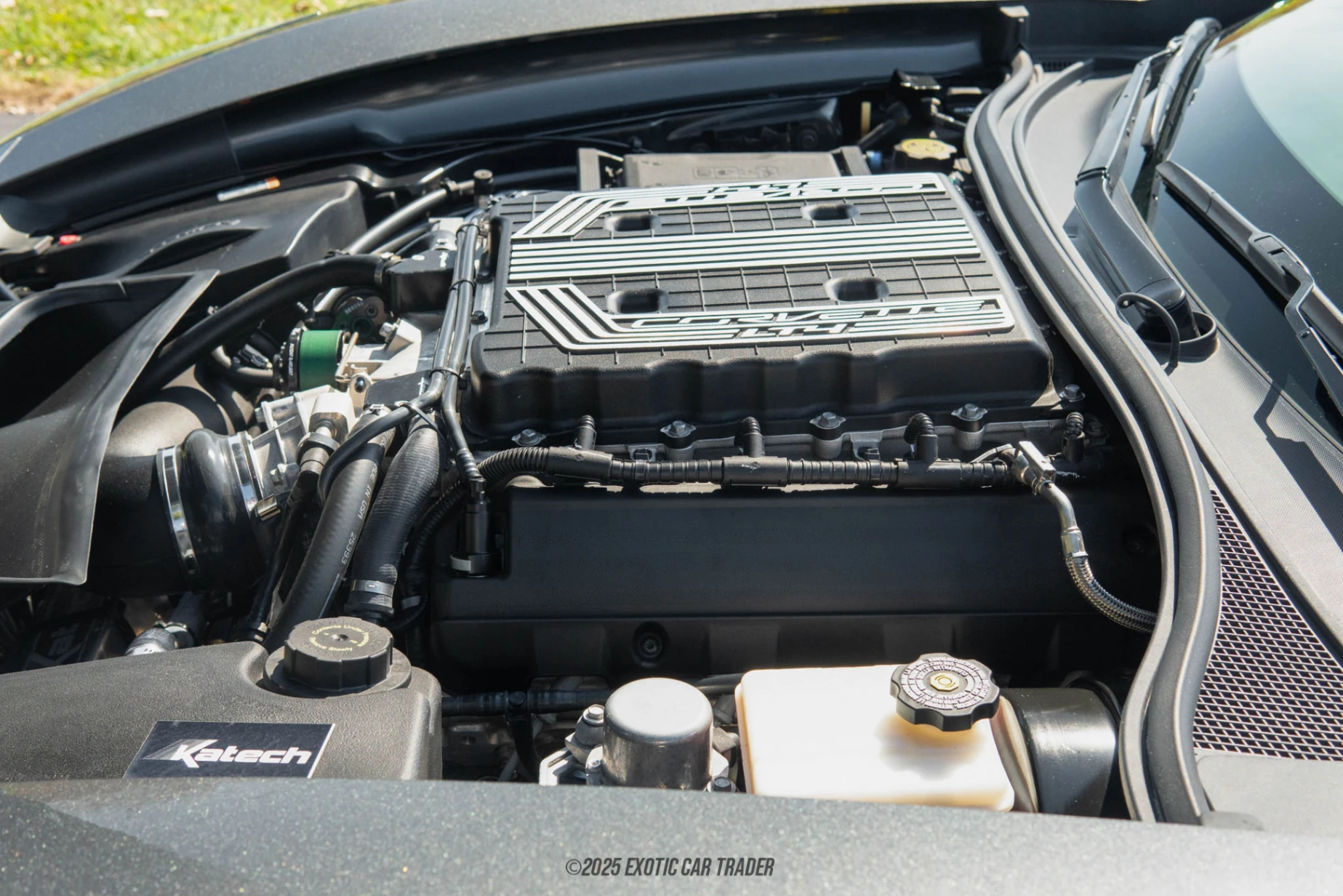 The exterior’s Watkins Glen Grey Metallic paint highlights the aggressive Z06 bodywork, including wide fenders, functional vents, and a front Katech Street Splitter that integrates with the car’s upgraded cooling system. The Spectra Gray painted aluminum wheels with machined grooves retain the factory aesthetic while housing ceramic disc brakes—ensuring stopping power to match its immense performance. Inside, the Jet Black perforated Mulan leather interior is both purposeful and premium, with paddle shifters, the Z06 2LZ Preferred Equipment Group, and modern amenities such as remote start, a premium infotainment suite, and dual-zone climate control.
