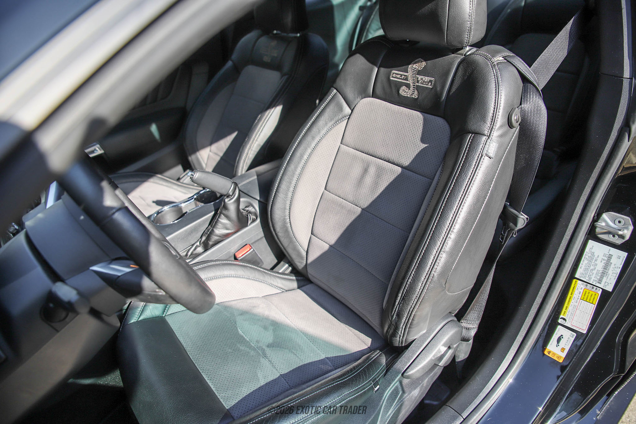 The exterior of this 2017 Ford Mustang Shelby Super Snake features a Shadow Black paint which provides a sinister backdrop for the full Shelby Super Snake treatment, including the functional dual-intake ram air hood, front splitter, rear diffuser, body-colored rear spoiler, carbon fiber mirror caps, and signature Shelby badging. Racing mesh grille inserts and Super Snake rocker graphics reinforce its identity, while 20-inch Shelby forged aluminum wheels fill the arches with an aggressive stance. The upgraded track handling suspension and wider performance tires give the car a planted, purposeful appearance. Inside this 2017 Ford Mustang Shelby Super Snake, the cabin reflects its Shelby heritage with custom two-tone leather upholstery and “Super Snake” embroidery in the seats and floor mats. A Shelby CSM serial number plaque confirms registry status, while carbon fiber interior accents and auxiliary gauge cluster emphasize its performance focus. Despite its extreme capability, the interior retains Mustang GT Premium comfort features, making it equally suited for spirited driving or longer highway cruises.
