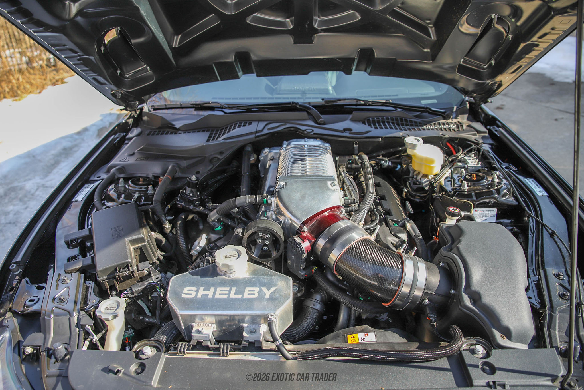 Under the hood sits a 5.0L Coyote V8 fitted with a high-polished Whipple supercharger engineered by Shelby to produce over 750 horsepower. This is a supercharged configuration, paired to a 6-speed manual transmission that provides direct driver engagement and control over the car’s immense power. Supporting upgrades include an extreme cooling system with upgraded radiator and aluminum heat exchanger, oversized intake components, upgraded fuel injectors, billet throttle body, and a Shelby-tuned Borla performance exhaust system. Drivetrain enhancements such as a one-piece driveshaft and upgraded half shafts help manage the increased output, while the Shelby/Wilwood performance brake system with 6-piston front and 4-piston rear calipers ensures confident stopping power. The track handling suspension sharpens response and stability, transforming the Mustang into a true high-performance machine capable of both straight-line dominance and road course capability.