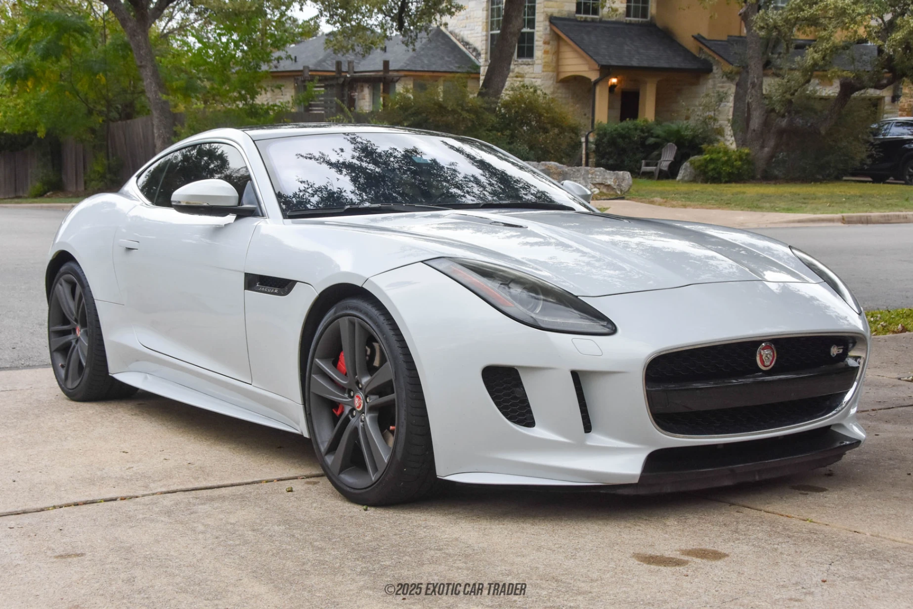 The Glacier White Metallic exterior pairs cleanly with the dark wheels and red calipers, giving the coupe a purposeful stance without appearing overly aggressive. The sculpted hood, wide front grille, and distinctive LED headlights highlight Jaguar’s design language, while the side vents and sloping roofline accentuate its sports-car proportions. Inside, the car features a black leather interior with white contrast stitching, a layout that emphasizes the driver with its cockpit-like center stack and supportive sport seats. The cabin materials appear well-kept, with the leather surfaces, stitching, and controls showing strong condition throughout.