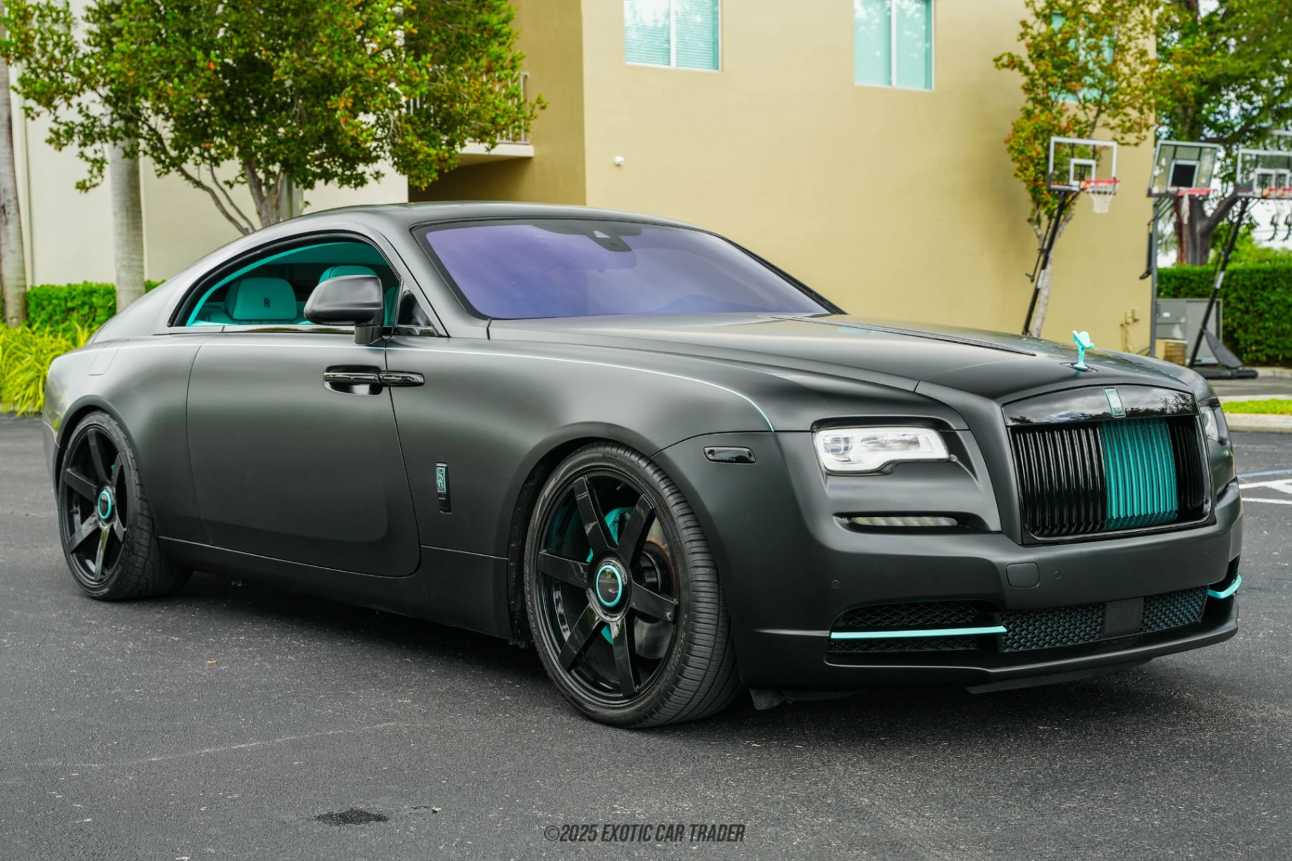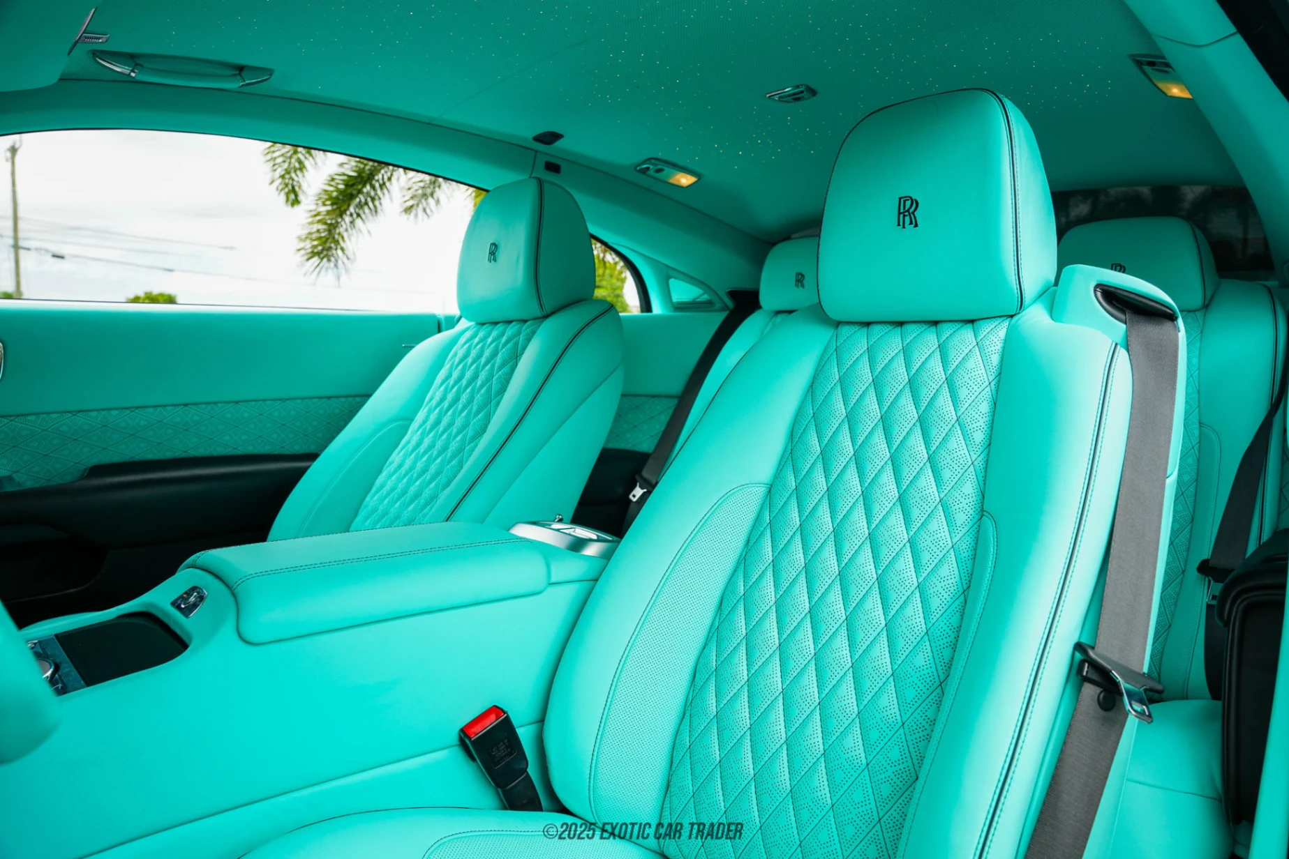 This 2017 Rolls-Royce Wraith is dressed in Metropolitan Blue Metallic but currently wears a matte black vinyl wrap. So, if you don’t want the darker persona, you can easily revert to the stock paint job. The car features a custom Tiffany Blue grille and exterior accents, as well as a Tiffany Blue Spirit of Ecstasy mascot. Then, you’ve got custom forged 7-spoke gloss black alloy wheels with Tiffany Blue brake calipers that bear the Rolls-Royce script on them directly behind. LED headlamps with automatic leveling pierce through the darkest of nights as you cruise along in this luxurious palace on wheels. Inside, this 2017 Rolls-Royce Wraith is a study in how to do luxury. You’ve got a custom Tiffany Blue interior with bespoke leather upholstery and contrasting black diamond quilted stitching. A starlight headliner is present to create a captivating environment at night, while the piano black veneer and RR monograms on all headrests add even more opulence to this already well-equipped cabin. Even as your feet sink seamlessly into the soft Lambswool floor mats you’ll be in heaven. Then, you’ve got amenities such as the Driver Assistance Systems 3 package, contrast seat piping, heated and power adjustable seats with memory, a Rolls-Royce bespoke audio system, a full infotainment suite and so much more. Even the trunk features a deep Royal Blue plush carpet lining.