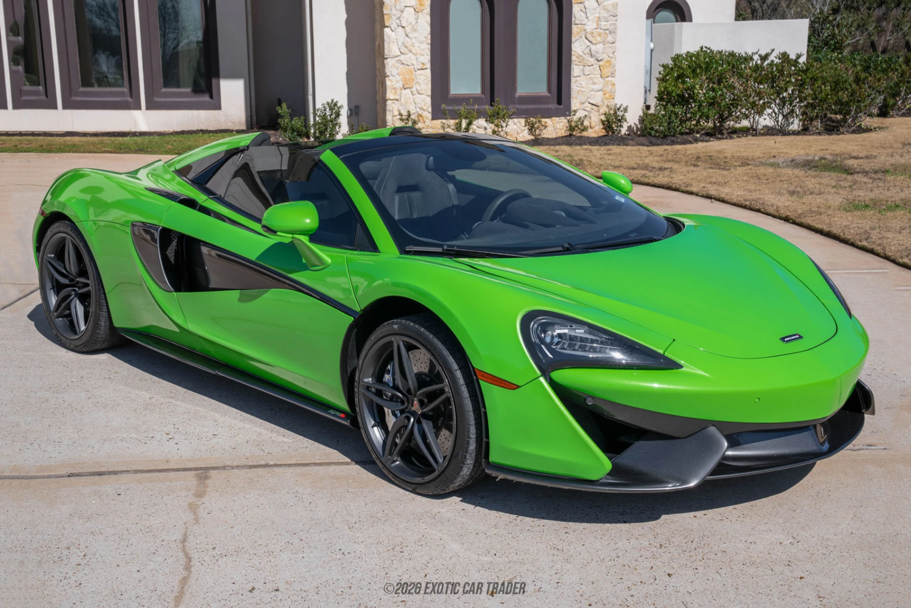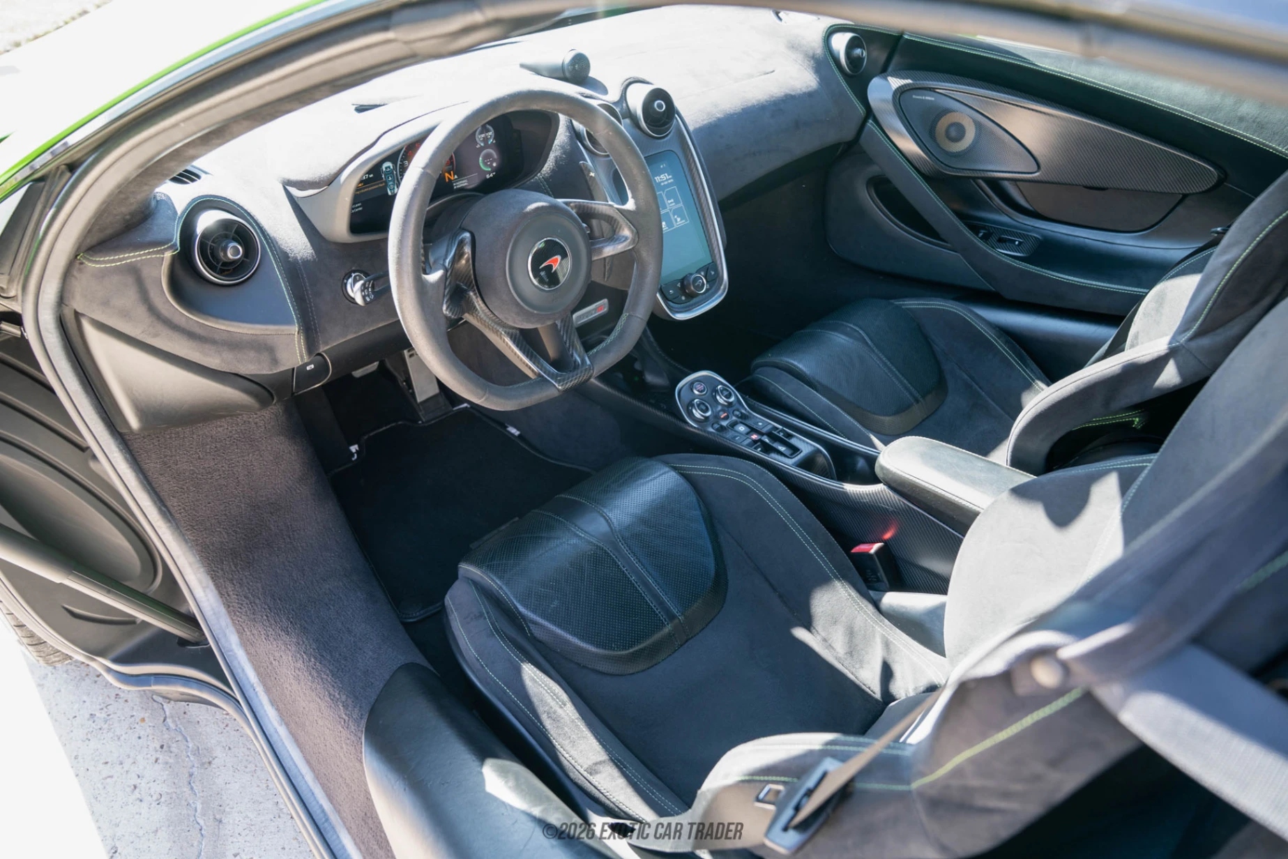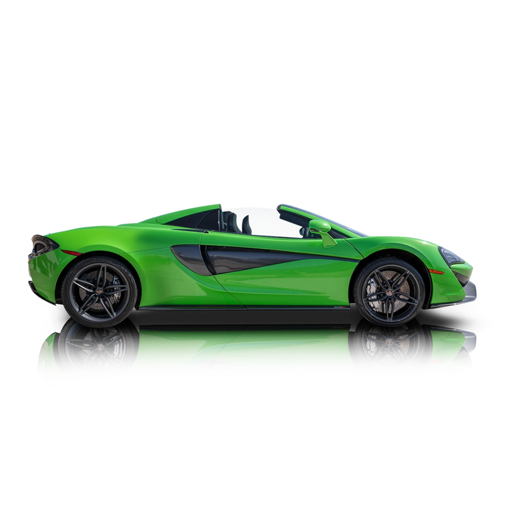The exterior of this 2018 McLaren 570S Spider is finished in Mantis Green over a Dark Palladium contrast roof, a high‑impact color combination that highlights the car’s dramatic side intakes and floating rear buttresses. Stealth‑finished 5 twin‑spoke forged wheels sit in front of carbon‑ceramic brakes with silver calipers, while exposed carbon fiber elements such as the lower aero pieces give the car a purposeful, motorsport‑inspired look. The interior of this 2018 McLaren 570S Spider is built around carbon fiber race seats trimmed in black leather and Alcantara with green contrast stitching, matching the exterior and emphasizing the car’s performance intent. A carbon fiber steering wheel, carbon‑trimmed center console and other carbon interior components reinforce the lightweight theme, while the Bowers & Wilkins audio system brings premium sound quality when the retractable hardtop is raised. Overall, the cabin mixes minimalist, driver‑centric design with enough comfort and tech to make regular use feel special rather than tiring.