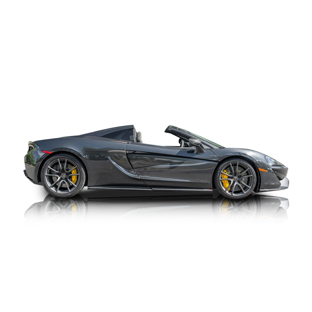 Power comes from a 3.8L twin-turbocharged V8 paired with a 7-speed dual-clutch transmission, delivering rapid acceleration and seamless gear changes. The lightweight carbon fiber chassis and rear-wheel-drive layout provide exceptional balance and agility, while carbon ceramic brakes offer strong and consistent stopping power. With sharp handling and impressive power delivery, this 570S Spider offers a pure and engaging driving experience whether carving through corners or cruising with the top down.