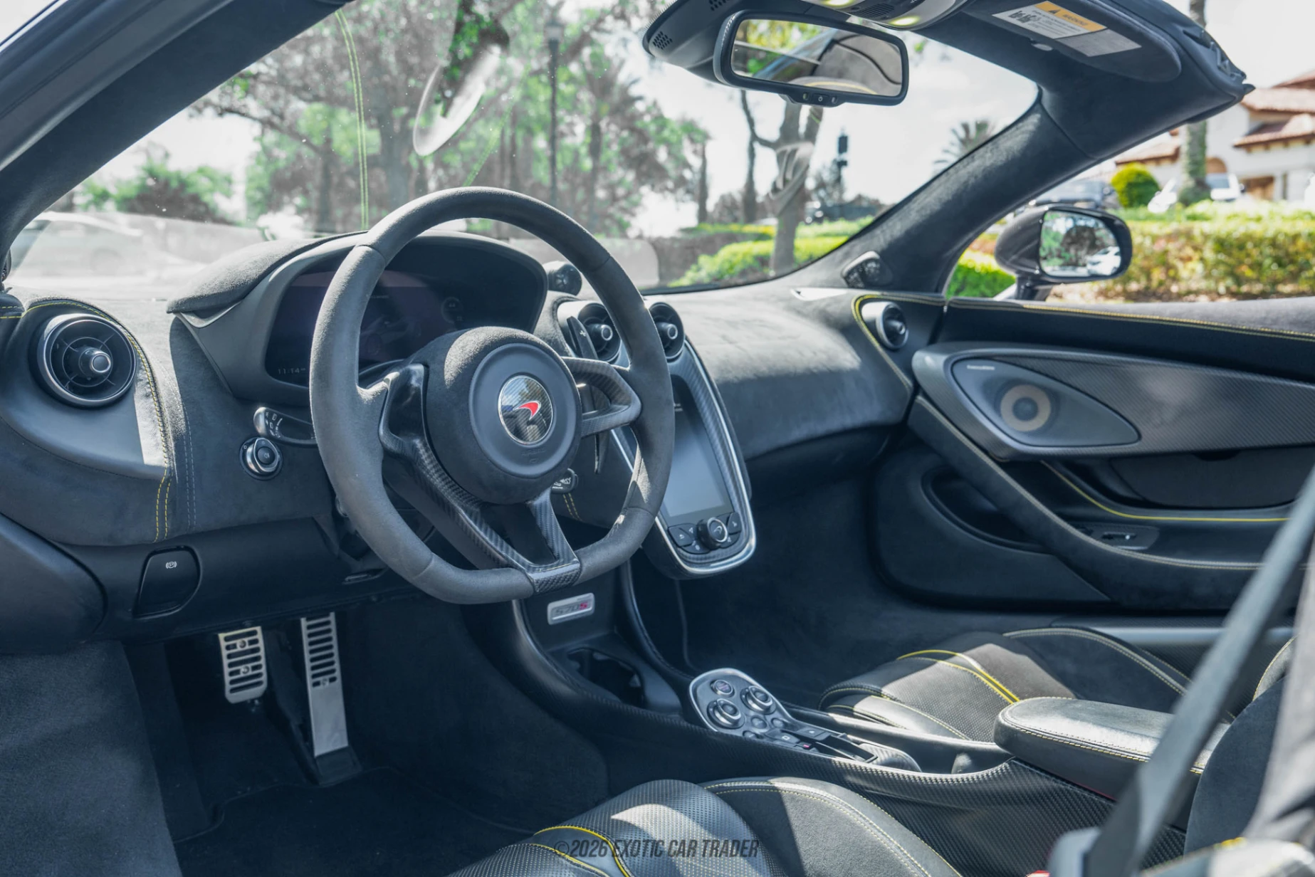 The exterior of this 2018 McLaren 570S Spider is finished in Storm Grey, a sleek and understated color that highlights the car’s sculpted aerodynamic design. The retractable hardtop seamlessly integrates into the body, allowing for both coupe-like refinement and open-air excitement. Carbon fiber exterior elements enhance both aesthetics and performance, while the yellow brake calipers paired with carbon ceramic brakes add a bold contrast behind the wheels. The overall stance is low, wide, and purposeful, reflecting its supercar pedigree. The interior of this 2018 McLaren 570S Spider is trimmed in Carbon Black Alcantara, accented by Sicilian Yellow contrast stitching that adds a sporty and bespoke touch. The cabin is focused on the driver, featuring a minimalist layout with high-quality materials and exposed carbon fiber from the interior package. Comfort and convenience are elevated with the Bowers & Wilkins premium sound system, while the supportive sport seats ensure an engaging driving position. The combination of Alcantara, carbon fiber, and contrast stitching creates a modern, performance-oriented environment that still feels refined.