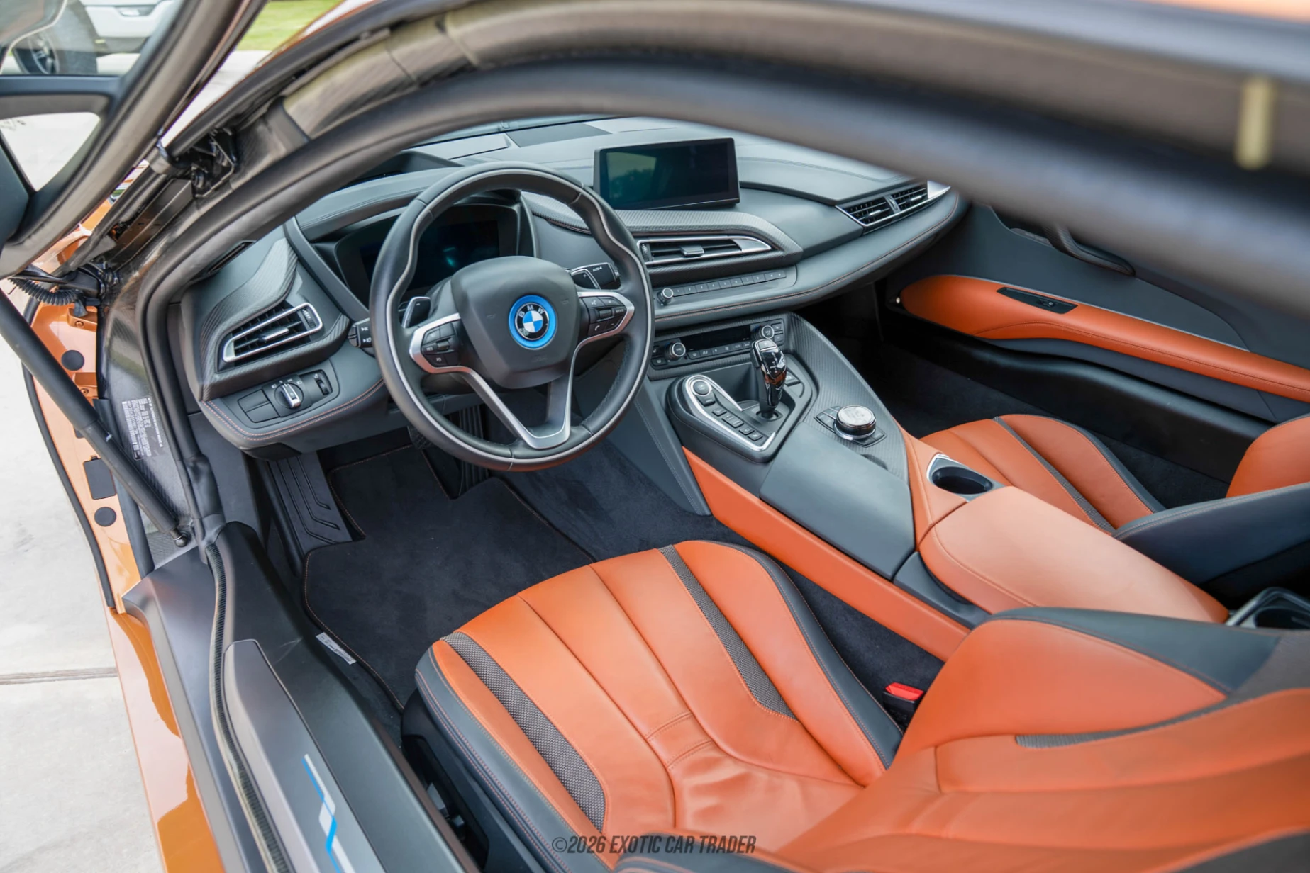 The exterior of this 2019 BMW i8 Coupe is unmistakably futuristic, finished in E-Copper Metallic with contrasting Frozen Grey accents that highlight its sculpted, aerodynamic design. Its low-slung stance, dramatic floating buttresses, and dihedral doors give it true supercar presence, while the 20-inch Jet Black radial-spoke wheels complete the modern aesthetic. The addition of BMW Laserlight headlights not only enhances nighttime visibility but also reinforces the i8’s advanced engineering identity, making this car look just as innovative today as when it debuted. The interior of this 2019 BMW i8 Coupe features the Tera World Copper package, combining natural leather and cloth in a unique E-Copper Exclusive finish. The cabin is both sustainable and luxurious, with premium materials and a driver-focused layout that emphasizes the car’s high-tech nature. Ceramic controls, an anthracite headliner, and refined trim details elevate the experience, while the hybrid-focused digital displays remind you that you’re piloting something truly different. Despite its exotic nature, the i8 remains comfortable and intuitive, offering a balance of innovation and everyday usability.