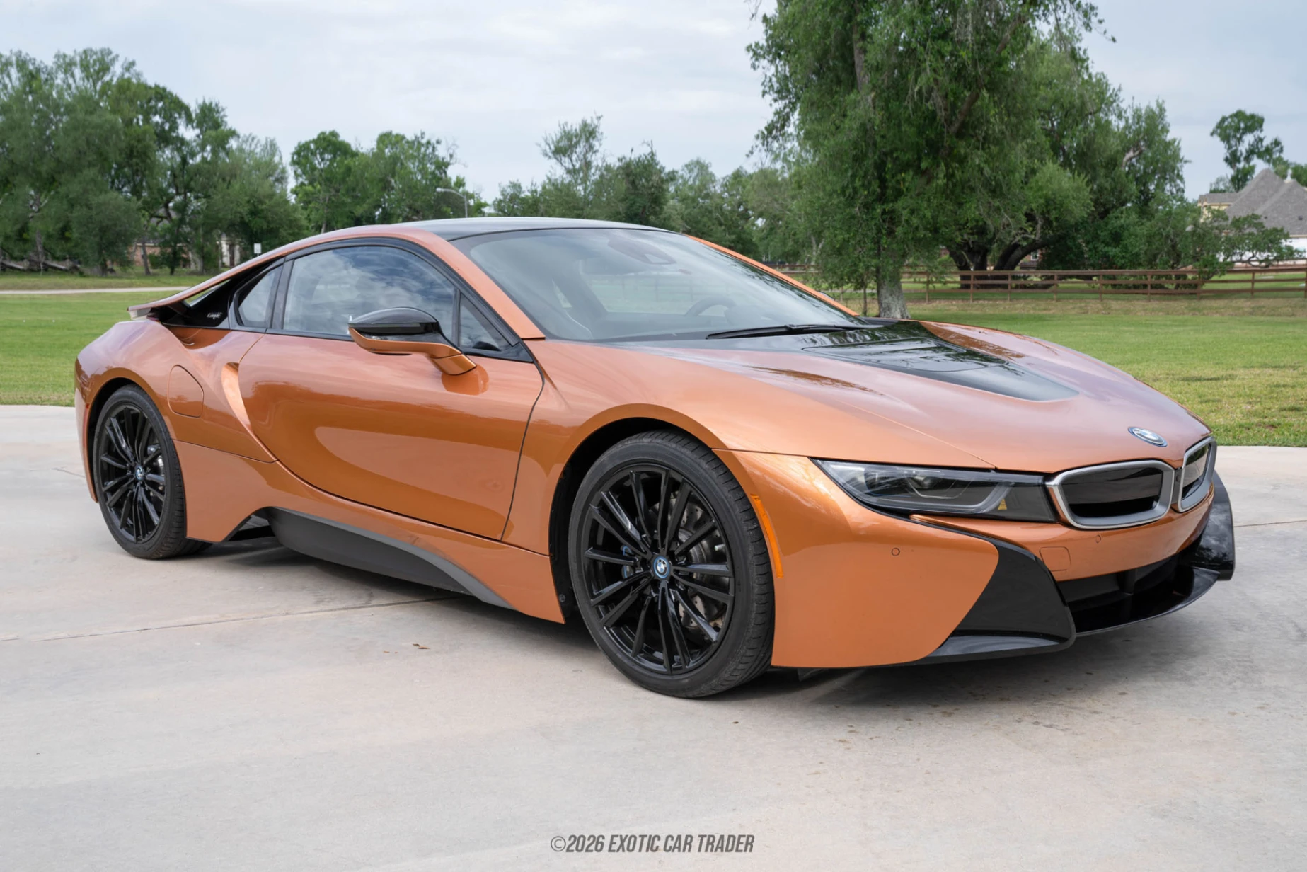 BMW’s i8 was never just a car — it was a statement about the future of performance. Blending exotic styling with cutting-edge hybrid technology, the i8 Coupe stood as one of the most forward-thinking sports cars of its era. This 2019 example benefits from the updated 11.6 kWh battery and increased system output, making it the most refined version of the model. With just 8,270 miles, it remains in like-new condition, offering a rare opportunity to own a near-pristine example of BMW’s carbon-fiber-bodied hybrid flagship. Finished in the distinctive E-Copper Metallic with Frozen Grey accents and equipped with premium options like the Tera World package and Laserlight headlights, this i8 delivers both visual drama and technological sophistication in equal measure.