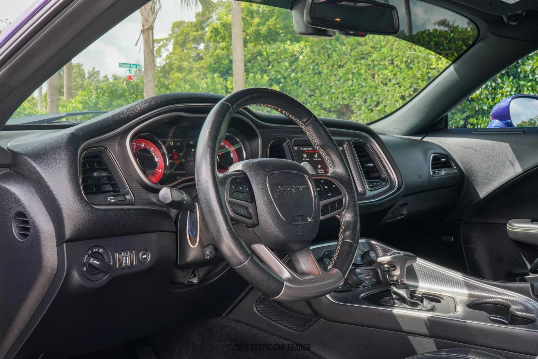 This 2019 Dodge Challenger SRT Hellcat is definitely one for the stand-outers. That’s because of its bright purple paint job, called Plum Crazy in Dodge parlance. Complementing this bright outlook is a massive set of 20-inch low-gloss black forged wheels that are 9.5 inches in width. That, the satin black-painted hood and SRT performance spoiler all make for something that’s definitely not afraid to shout out its powerful persona. The interior of this 2019 Dodge Challenger SRT Hellcat offers comfortable leather seating for four adults. It’s got air conditioning with climate control, the usual power convenience features, a multifunction steering wheel, cruise control, paddle shifters, a full infotainment suite, and an Alpine premium speaker system. There are plenty of storage spaces in the cabin, as well as a surprisingly roomy trunk.