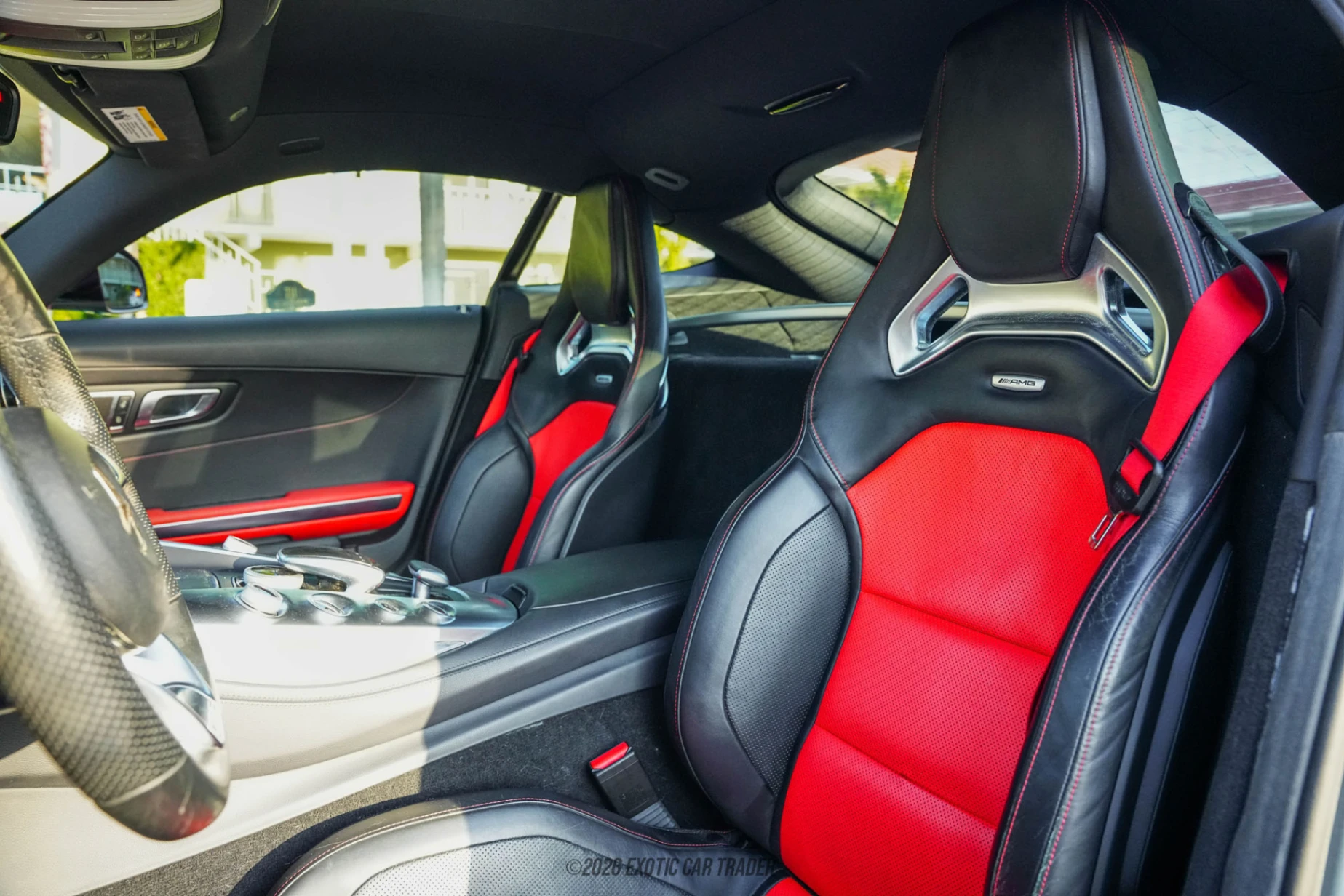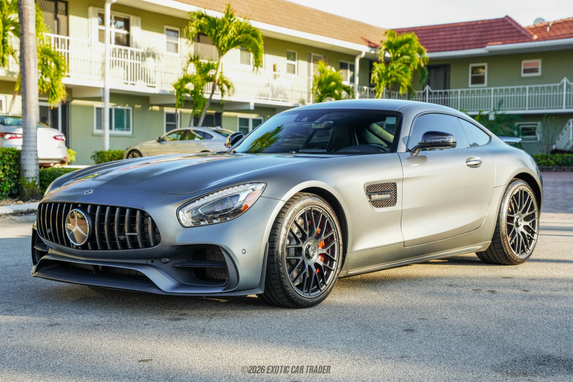 The exterior of this 2019 Mercedes-AMG GT is Designo Selenite Grey Magno, a premium matte finish that enhances every curve of the long hood and wide rear haunches. The AMG Aerodynamic Package adds a more aggressive front splitter, fixed rear wing, and aerodynamic enhancements that improve both downforce and presence. The AMG Exterior Night Package blacks out exterior trim elements for a more sinister appearance, perfectly complementing the staggered 19-inch front and 20-inch rear AMG forged cross-spoke wheels in black. Rear deck lid badge delete keeps the look clean and understated, allowing the car’s proportions and stance to do all the talking. The interior of this 2019 Mercedes-AMG GT is trimmed in Red Pepper and Black perforated Nappa leather, creating a cockpit that feels both luxurious and race-inspired. Heated and ventilated front seats ensure comfort in all climates, while red seat belts tie the cabin together with subtle motorsport flair. AMG Silver Chrome trim adds a refined metallic contrast across the center console. The Burmester Surround Sound System delivers premium audio quality, and Keyless GO enhances everyday usability. The layout remains driver-focused, with a wide center console and aviation-style controls emphasizing that this is a purpose-built sports machine.
