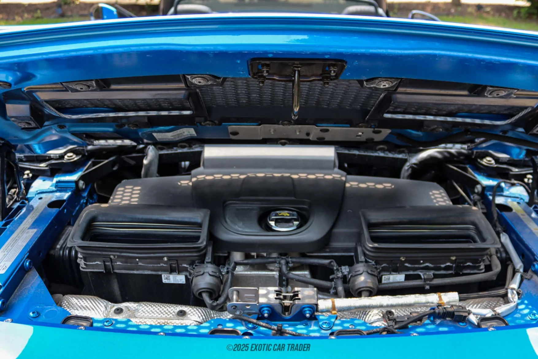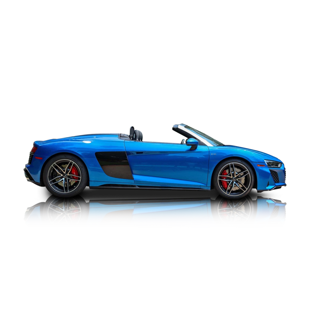 Dressed in blue, the first thing you’ll doubtless notice about this 2020 Audi R8 Quattro V10 Spyder is its convertible body style. That’s because with the top down, the car looks really distinctive. It’s almost like the designers came up with the convertible variant first! Fret not, the car still looks fabulous when its powered black soft top is raised. Then, elements such as its dual exhausts, contrasting black side blades and red brake calipers take over. The two-seat passenger cabin of this 2020 Audi R8 Quattro V10 Spyder is very Audi-like in its luxurious nature with a generous serving of sporting thrown into the mix. You’ll find automatic climate control with air conditioning, a full infotainment suite and a Bang & Olufsen speaker system. Then, there’s a multifunction steering wheel, powered seat adjusters and a fully digital gauge cluster that really excites, especially when you see that 10,000-rpm tachometer! Since the engine sits behind the passenger cabin, your cargo space comprises a front trunk or frunk which can easily accept two or three soft bags.