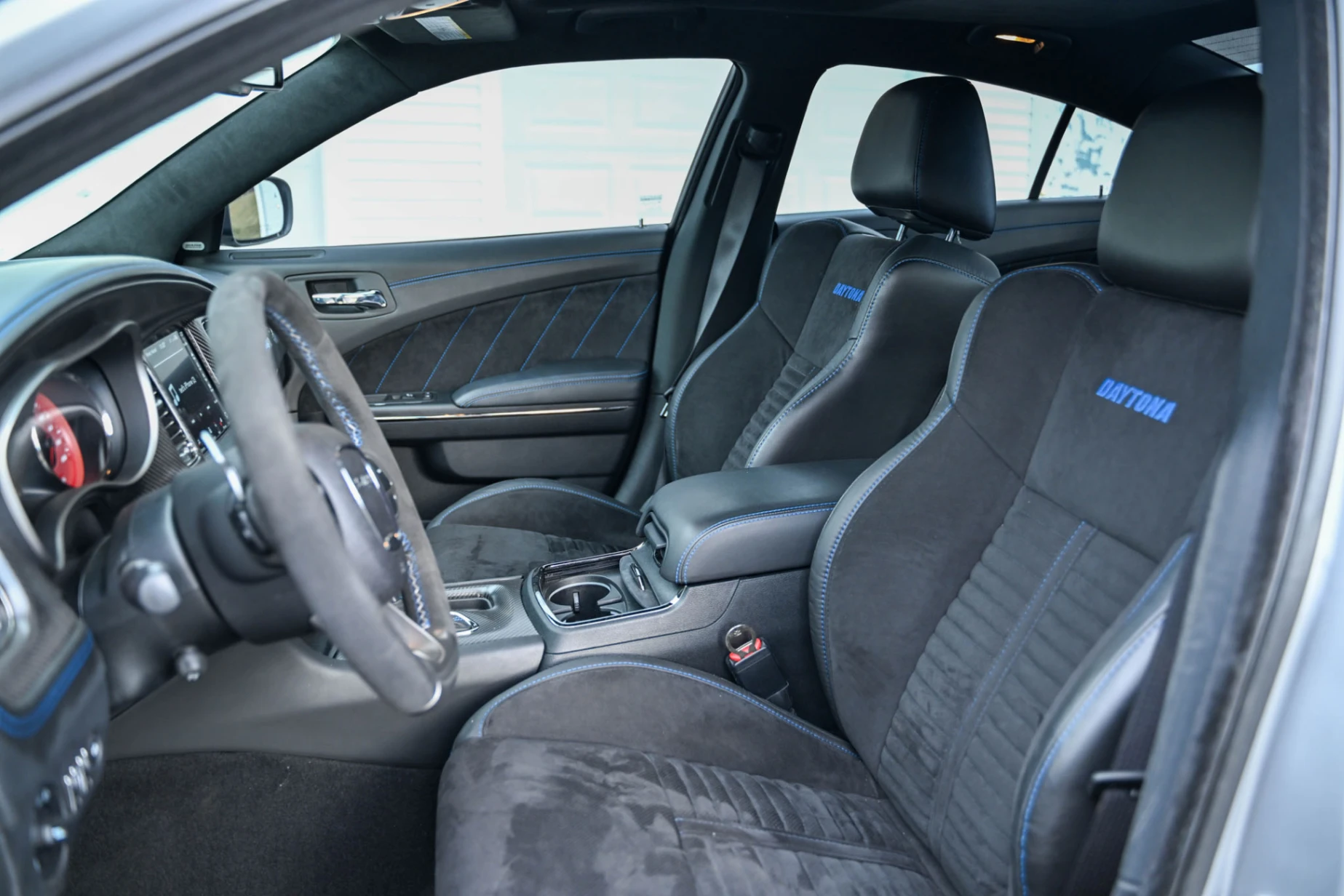 Draped in Triple Nickel paint, this special edition Dodge gives off a beautiful metallic look from first glance. This exterior is adorned with a white SRT fender badge and white Daytona graphics across the rear quarter panels and decklid. Atop the decklid is a white widebody spoiler. The car's posture is enhanced by 20-inch x 11.0-inch Satin Carbon Warp Speed wheels. The wheels have black brake calipers that contrast sharply against them. The Black interior of this 2020 Dodge Charger SRT Hellcat Daytona 50th Anniversary edition is accented with blue stitching that extends across the seats and console. It boasts the Customer Preferred Package 23K, Navigation & Travel Group, and Power Convenience Group. The Daytona 50th Anniversary Numbered IP Badge is proudly displayed on the dash. The Daytona theme continues into the cabin with Daytona 50th Anniversary seats featuring embroidered logos. Passengers are granted ventilated and heated front seats, heated second-row seats, power front driver and passenger seats with 4-way power lumbar adjustment. Illuminated rear cupholders, a suede headliner overhead, and real carbon fiber interior accents add subtle touches of luxury. Modern conveniences include a power tilt/telescoping steering column with an Alcantara-wrapped steering wheel, a power sunroof, and memory for the radio, driver seat, and exterior mirrors, as well as navigation.
