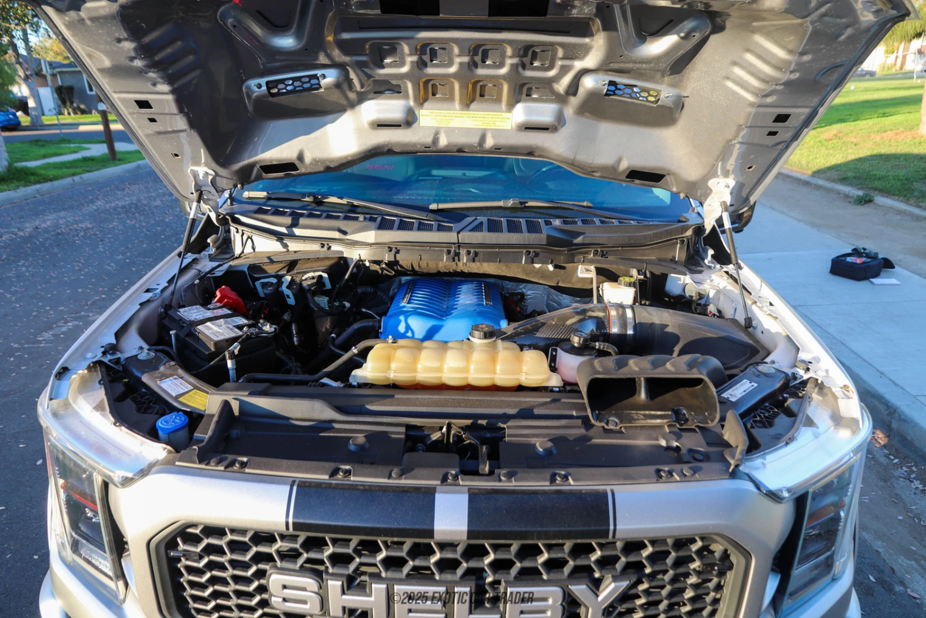 This 2021 Ford F-150 Shelby Super Snake's exterior presence is elevated not only by Shelby’s aggressive bodywork and suspension stance, but also by a full-body satin paint protection film that preserves the finish while giving the truck a distinctive, muted appearance. This protective layer enhances durability against road wear and environmental exposure while maintaining a high-end aesthetic. Inside, the Shelby-appointed cabin is further improved with upgraded speakers, providing enhanced audio clarity and volume over the standard setup. An integrated K40 radar detection system is discreetly installed, adding an extra layer of situational awareness during highway driving without compromising the factory interior appearance.