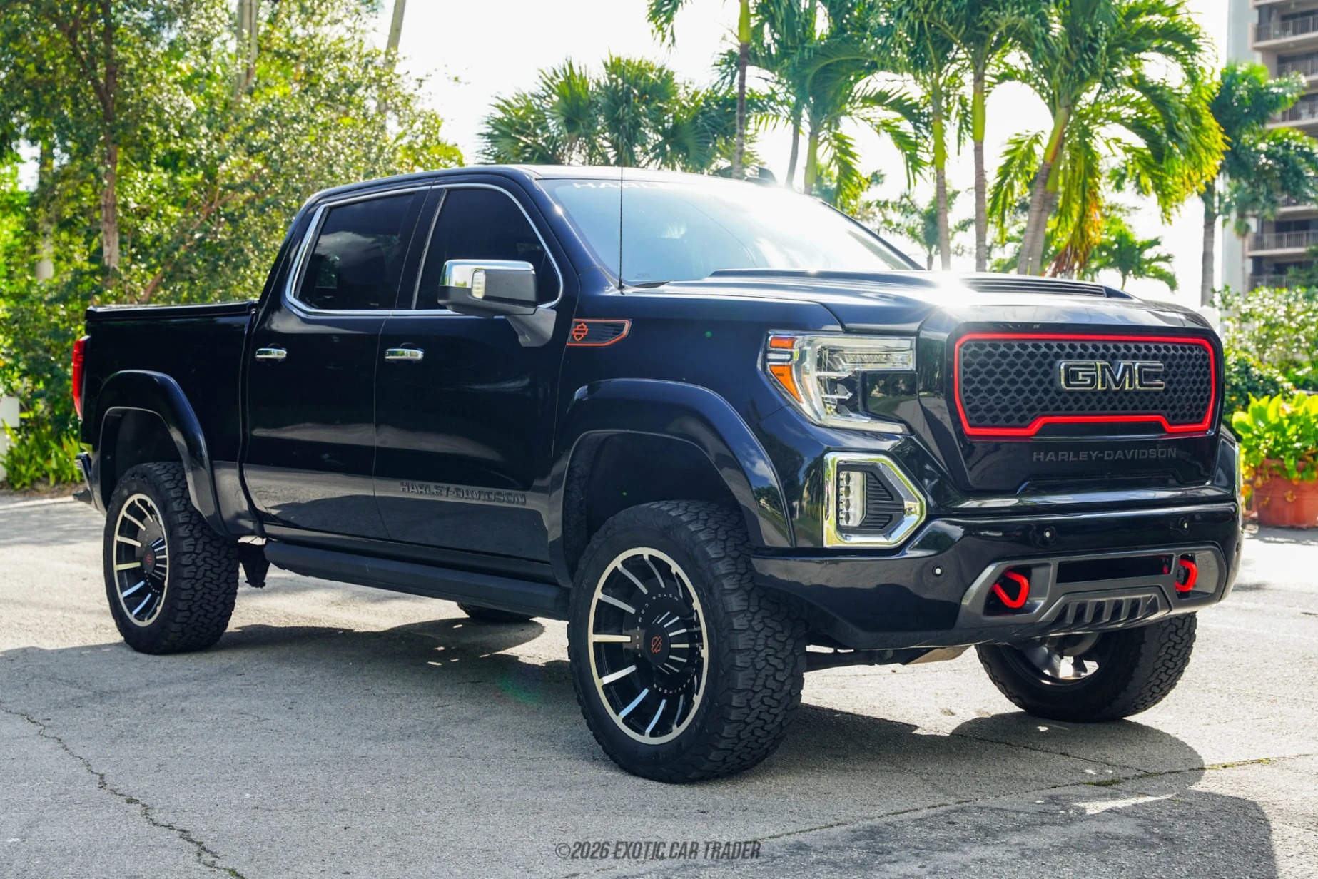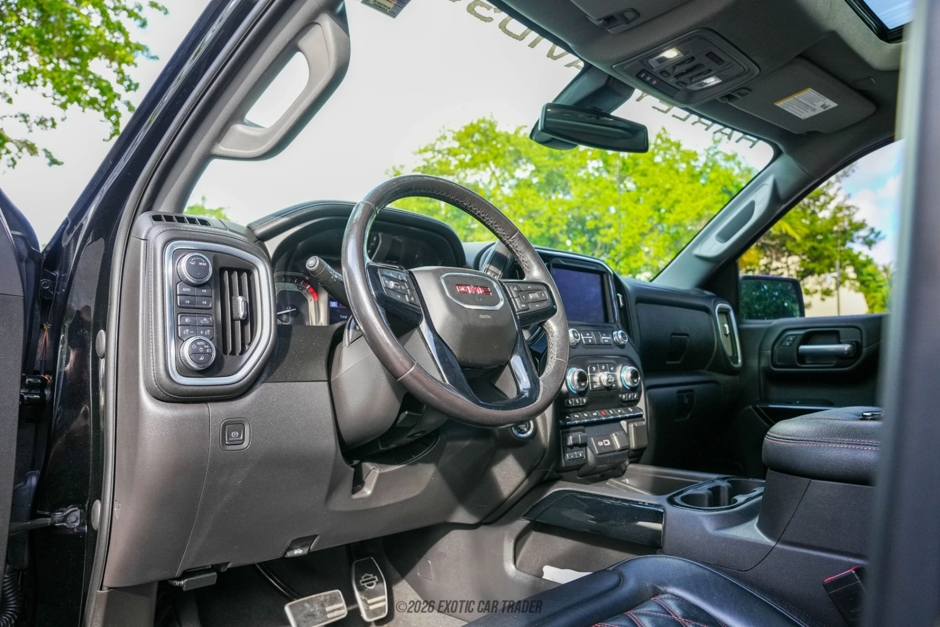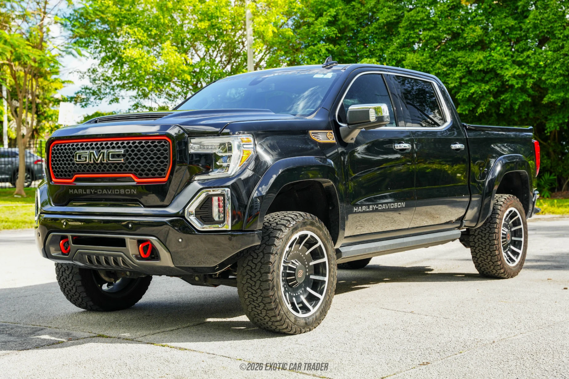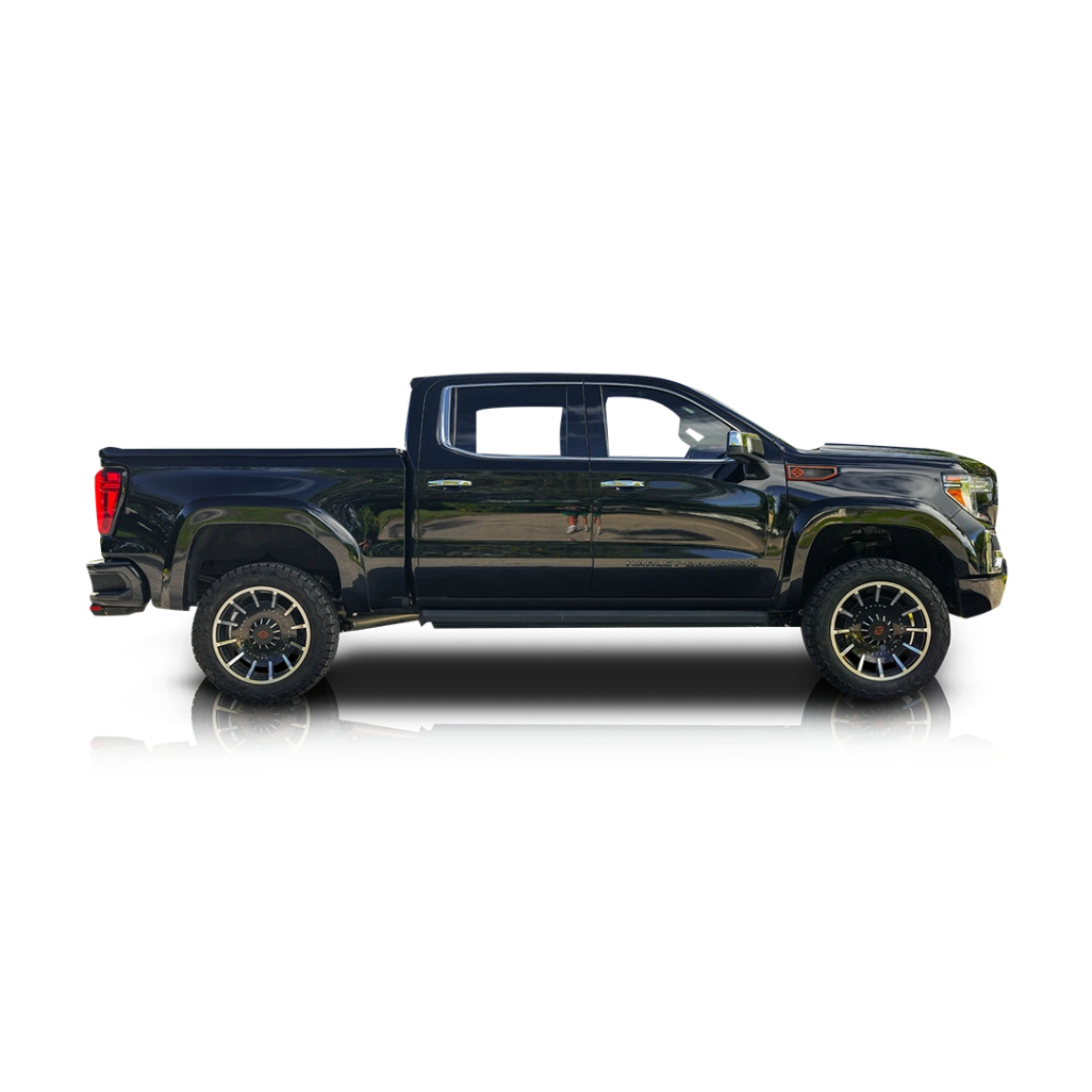Finished in Onyx Black, the exterior of this 2021 GMC Sierra 1500 is distinguished by a Harley-Davidson–specific grille design, exclusive badging, and custom visual accents that separate it from standard SLT, AT4, and Denali models. The appearance package is complemented by 22-inch “Fat-Boy” milled aluminum wheels, a lifted stance provided by a BDS suspension system with Fox performance shocks, and aggressive all-terrain tires. These upgrades give the truck a commanding road presence without altering its core factory structure. Inside, the Jet Black interior features Harley-Davidson–exclusive trim elements and subtle branding layered over the SLT Premium Plus Package, which includes upgraded materials, comfort features, and advanced infotainment, along with a power sunroof that enhances the cabin’s open, upscale feel.