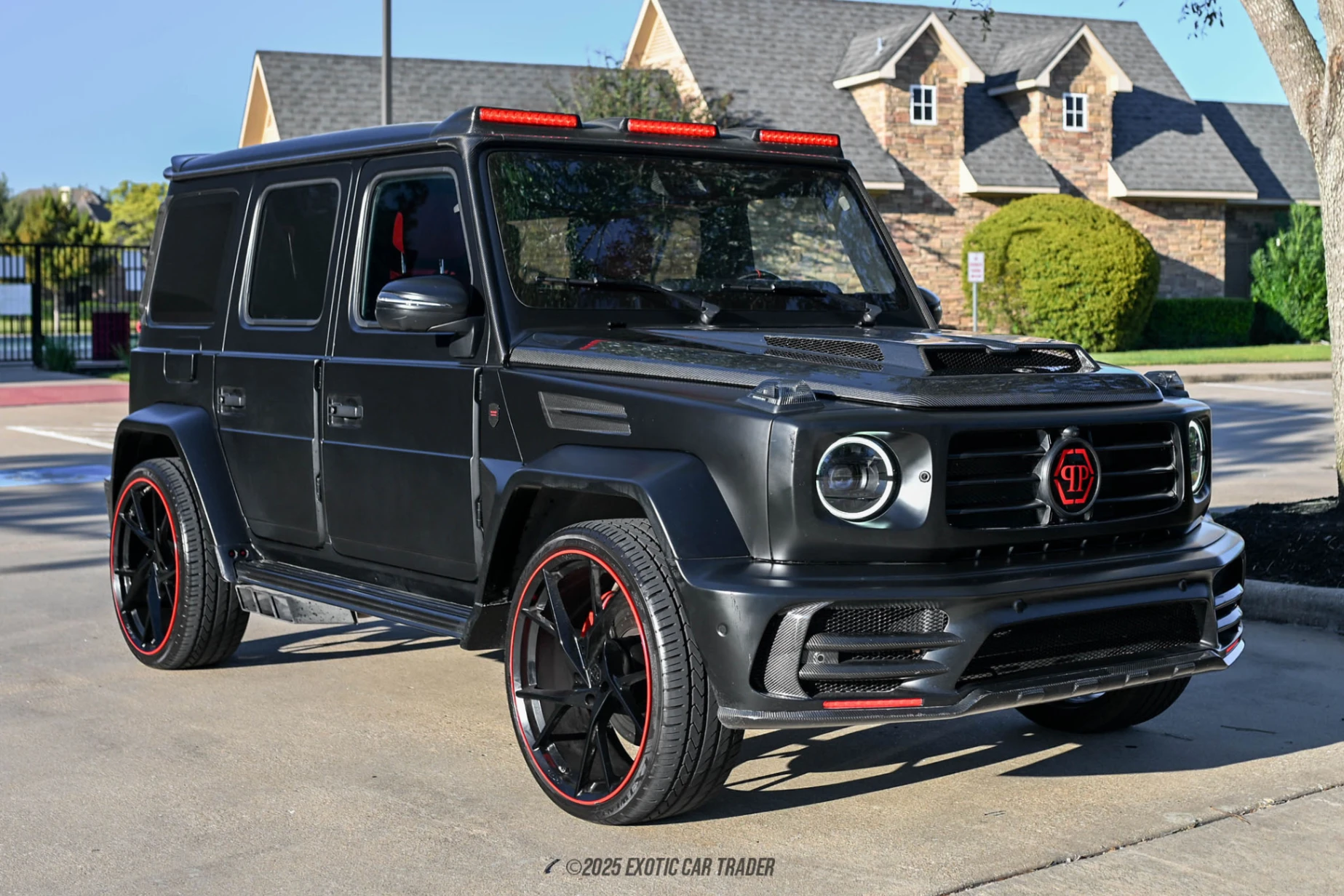 Finished in Obsidian Black Metallic with a full matte black vinyl wrap, this 2021 Mercedes-AMG G63 turns heads with its aggressively dominant appearance. Thanks to the wide-body carbon fiber style body kit, this G-Wagon enjoys a carbon fiber style front bumper, side skirts, wheel arches, and rear apron. From the satin carbon finishes to Philipp Plein’s signature branding, this vehicle exudes rarity. The large forged wheels are outlined in red, giving a subtle hint at the interior color combination. The LED accent lighting and custom roof-mounted light bars definitely add more mph to the exterior. Inside, the cabin blends red and black premium leather with custom seat designs, featuring Philipp Plein logos embossed into the headrests and diamond-quilted stitching. Aluminum pedals, carbon-fiber style trim panels, and the sport steering wheel wrapped in Alcantara and carbon fiber elevate the sporty look of the interior. the Limited Edition Nr. 001/20” plaque on the center console celebrates its exclusivity. Tech amenities like navigation, high-tech digital cockpit, multimedia control, and performance displays elevate the overall driving experience.