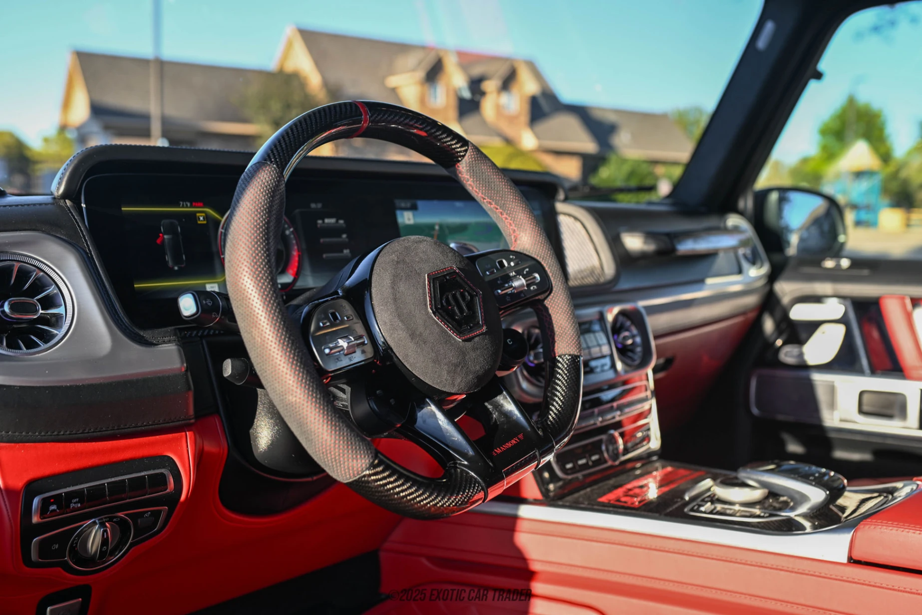 This 2019 Mercedes-AMG G63 blends factory performance with a suite of high-end upgrades that elevate it far beyond a standard AMG SUV. Finished in designo® Night Black Magno and equipped with the AMG Night Package, it pairs stealthy presence with unmistakable aggression. The handcrafted AMG 4.0L Biturbo V8 is further enhanced through an aftermarket intake, downpipes, and a Stage 2 performance tune, giving this G63 significantly more power and sharper throttle response than stock. Inside, the vehicle features a full custom interior, transforming the cabin into a bespoke luxury environment far richer and more dramatic than factory offerings. With its wide-screen displays, carbon fiber trim, and LED starlight headliner, this G63 is a uniquely personalized super-SUV.