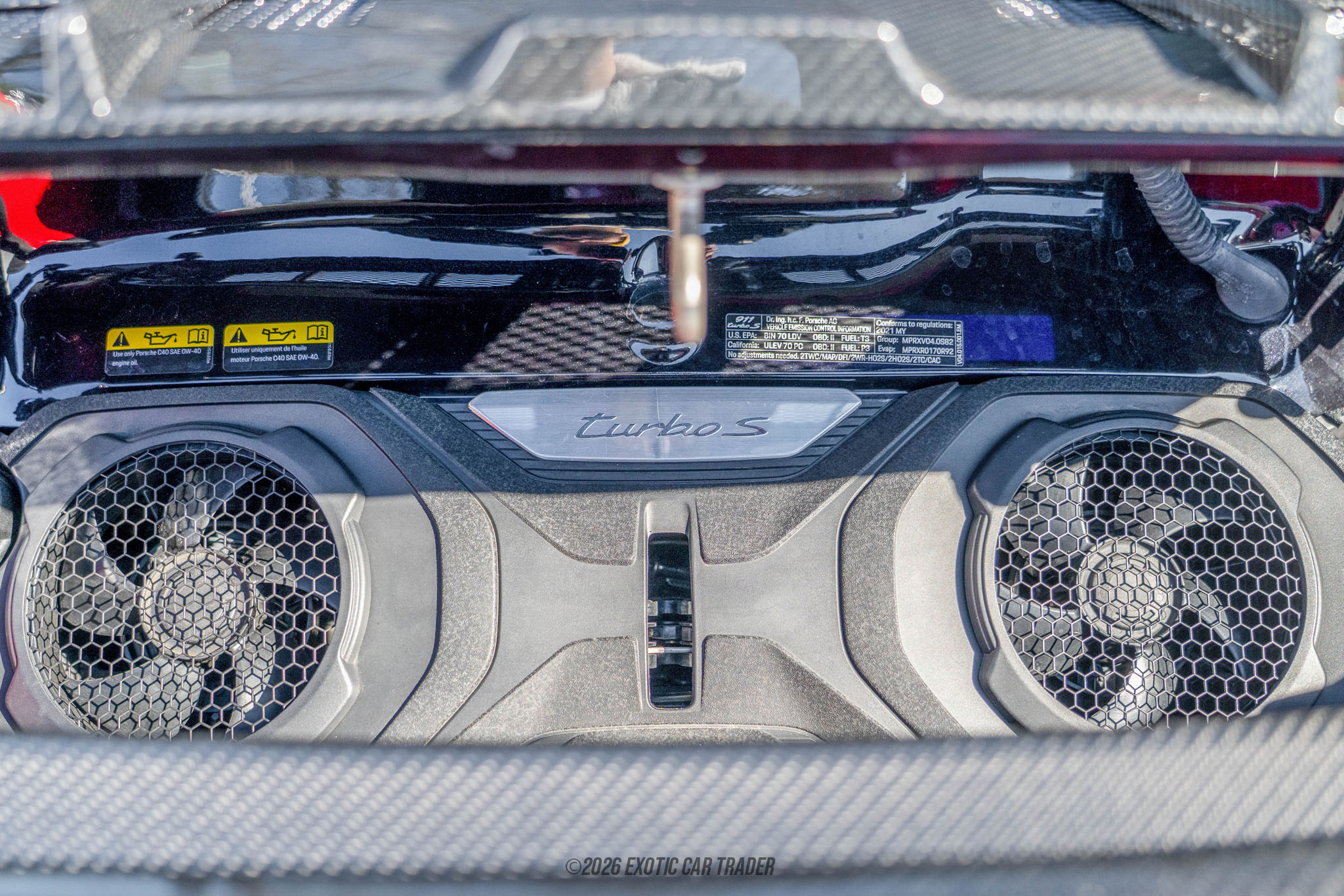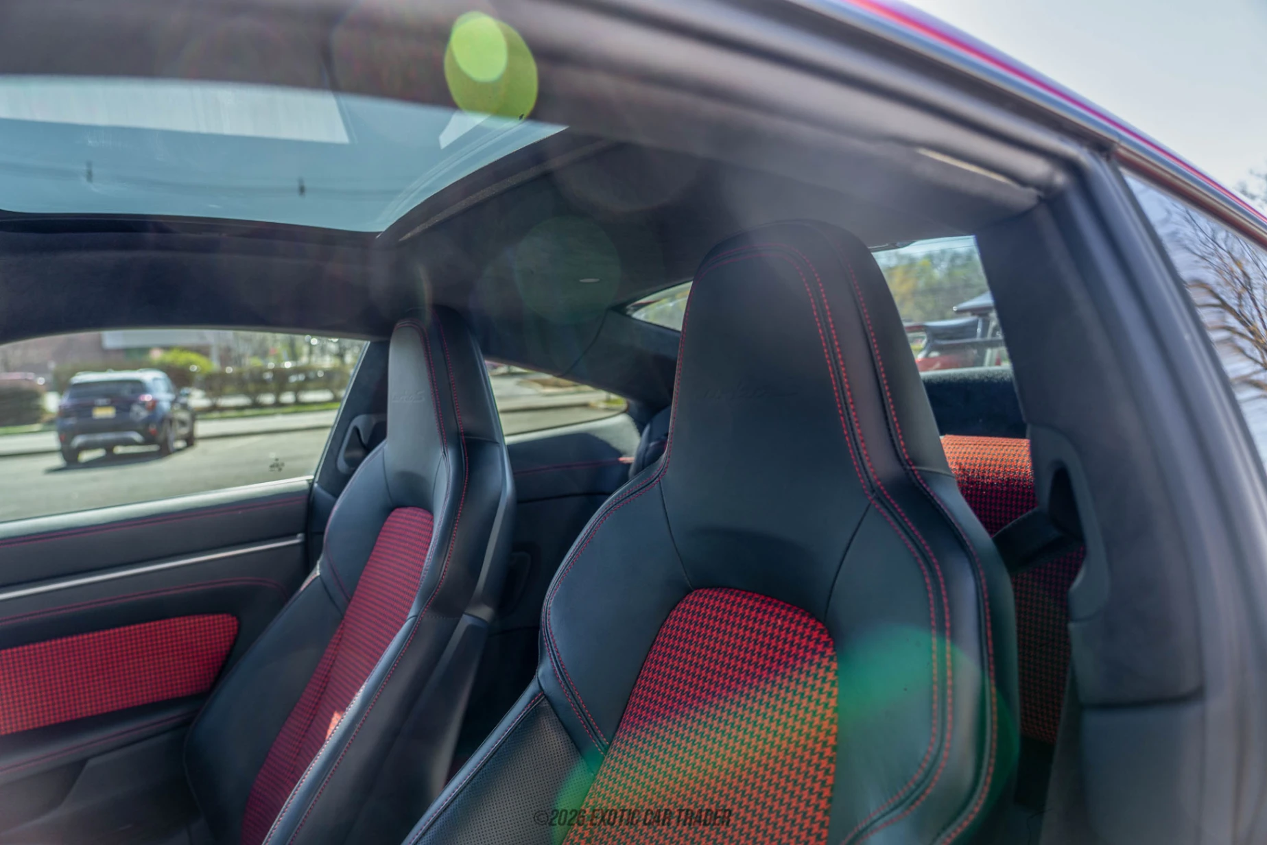 The exterior of this TECHART GTstreet R America based on a 2021 Porsche 911 Turbo S Coupe is a masterclass in aggressive yet cohesive design. The full GTstreet R aerodynamic package transforms the already muscular 992 into something far more exotic, featuring a carbon-intensive composition that includes a sculpted front apron, vented aero hood, widened fenders, deep side skirts, and a dramatic multi-element rear wing. Every component is purpose-built, contributing both to visual presence and aerodynamic performance. The car is finished in a full Guards Red wrap, a bold and unmistakable choice that amplifies its commanding presence, while the underlying bodywork benefits from extensive fitment, paintwork, and refinement to achieve a factory-quality result. TECHART Formula VI Race wheels paired with Michelin Pilot Sport Cup 2 tires complete the stance, further enhanced by H&R lowering springs. The interior of this TECHART GTstreet R America based on a 2021 Porsche 911 Turbo S Coupe is where craftsmanship truly meets individuality. Completely reupholstered, the cabin features black leather throughout, accented by Guards Red stitching and striking red/black houndstooth inserts across the seats, door panels, and dashboard. This bespoke execution elevates the interior well beyond factory or even standard TECHART specifications. Complementing this is the TECHART steering wheel in leather and Alcantara, along with illuminated carbon door sills, aluminum pedals, and GTstreet R-specific elements including the serial designation and accessories. Additional refinements include a red gauge cluster and clock dial conversion, as well as a digital rearview mirror for modern usability. The result is an interior that feels both tailored and performance-focused, blending classic motorsport cues with contemporary luxury.