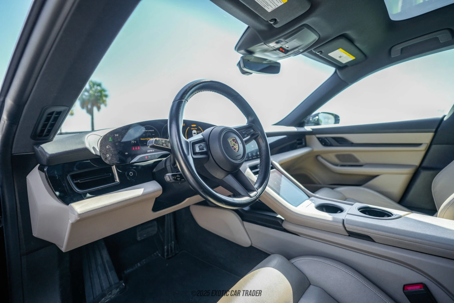 Finished in black and riding on 20-inch Taycan Turbo Aero wheels, the exterior presents a clean, aerodynamic profile focused on efficiency without sacrificing presence. Inside, the black and limestone beige two-tone leather interior creates a bright and upscale atmosphere. The cabin is further enhanced by features such as a fixed panoramic glass roof, ambient lighting, ventilated front seats, and a Bose surround sound system, all contributing to a modern, comfortable, and technologically advanced interior environment.
