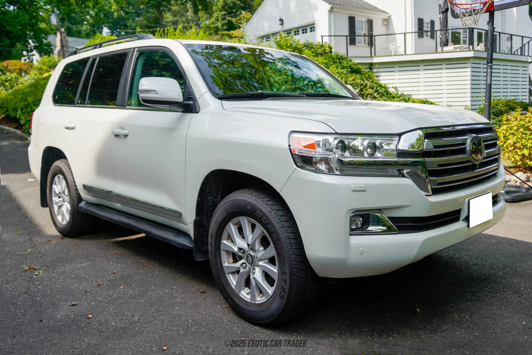 The 2021 Toyota Land Cruiser carries a commanding yet refined presence, designed to look equally at home in a downtown setting or tackling rugged trails. Finished in Blizzard Pearl white, its clean lines are complemented by subtle details such as darkened light housings and a black grille, which add a modern edge to its traditional SUV profile. It rides on silver 18-inch alloy wheels wrapped in Dunlop Grandtrek all-terrain tires, a setup well-suited for both urban commutes and off-road excursions in challenging conditions. Inside, the Land Cruiser delivers an upscale environment with functionality in mind. The cabin is appointed with perforated leather-trimmed seating, offering heated and ventilated front seats and heated second-row seating for passenger comfort. A heated leather steering wheel, premium materials, and Toyota’s hallmark attention to ergonomics create a balance between luxury and durability. With a spacious layout, four-zone automatic climate control, and a cooler box in the center console, the interior ensures long journeys remain comfortable, while the 14-speaker JBL premium audio system with integrated navigation and a 9-inch touchscreen enhances both convenience and entertainment.The passenger cabin of this 2021 Toyota Land Cruiser comes with black leather seating for up to seven occupants. The third row seamlessly folds away when not in use, granting you a spacious cargo area as a result. Of course, this vehicle is superbly equipped with features. Four-zone climate control, a wireless phone charger, blind-spot monitoring, and lane departure warning are all standard. There’s a lovely JBL Synthesis sound system and a full infotainment suite for all your entertainment needs. A multifunction steering wheel, cruise control and powered front seats are included too.