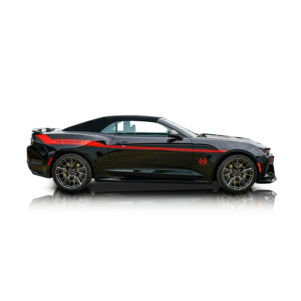 Wearing a black coat of paint punctuated by some red detailing, this 2022 Chevrolet Camaro ZL1 Convertible Hennessey Exorcist certainly looks fierce no matter which angle you gaze upon it from. The car’s powered black canvas top can be lowered to really let you hear that supercharged V8 scream, while Hennessey and Exorcist exterior badging are present to tell people that this isn’t your base model Camaro. The interior of this 2022 Chevrolet Camaro ZL1 Convertible Hennessey Exorcist comes with a serial numbered dashboard plaque that’s identical to the one in the engine bay. You’ll also find Hennessey premium floor mats. Otherwise, everything else is more or less standard Camaro ZL1 which means leather-upholstered seats with sporty bucket units at the front. There’s a rear seat too, but more suited to children and more petite adults. The front seats are heated and ventilated, and there’s dual-zone automatic climate control as well as a full infotainment suite. Yes, this is a daily drivable car.