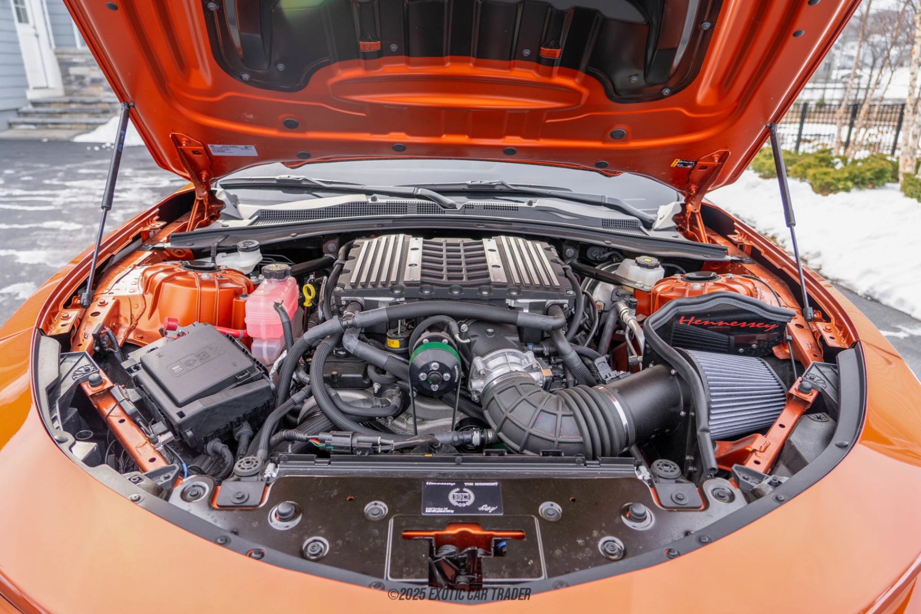 This 2022 Chevrolet Camaro ZL1 Hennessey Exorcist Convertible will definitely turn heads as it cruises or cruises by in its Vivid Orange Metallic coat of paint. The car sits low to the ground and sports exterior and underbody LED lighting, controlled via the OPT7 Connect phone app. Since it’s a drop-top, you’ve got a powered black convertible top at your disposal. Let’s check out the interior, then. The four-seat passenger cabin of this 2022 Chevrolet Camaro ZL1 Hennessey Exorcist Convertible is a thrilling place to be, but you definitely want to be in the driver's seat. It’s not much changed from a regular Camaro, so you’ve got Apple CarPlay, Android Auto, automatic climate control with air conditioning, and the usual powered convenience features. It’s also got a nice analog gauge cluste,r which is far more thrilling than any digital one can ever be, especially when the speedometer runs all the way to 200mph!