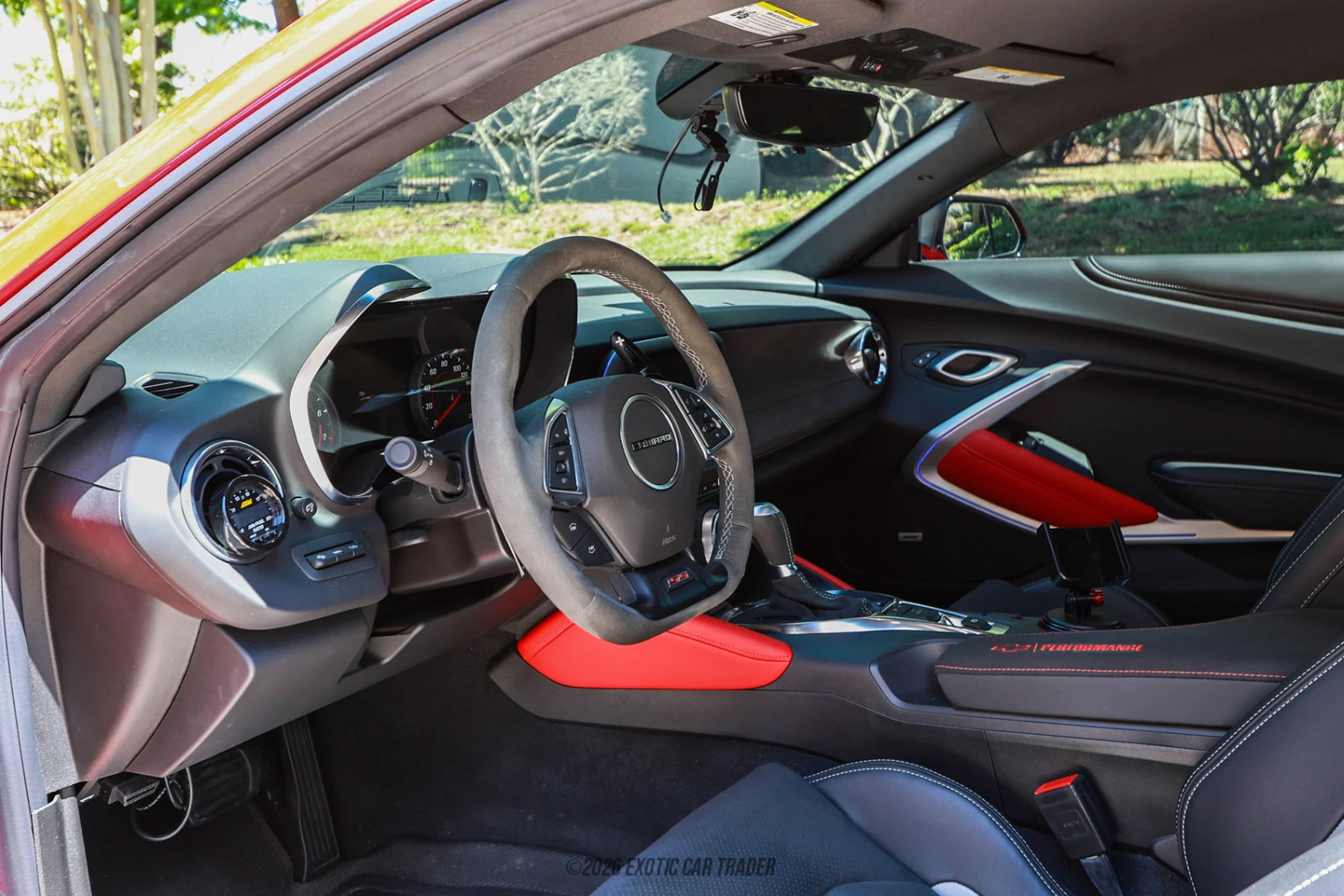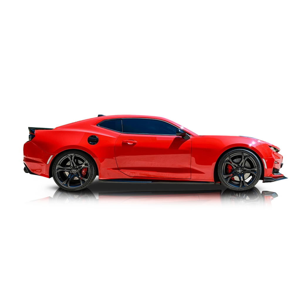 The exterior of this 2022 Camaro 2SS 1LE is finished in Red Hot, a bold color that perfectly complements the car’s aggressive design and aerodynamic enhancements. Factory 1LE elements are paired with aftermarket upgrades including a ZL1-style rear diffuser, side skirts, and a wicker bill rear spoiler, giving the car a more track-inspired appearance. The roof, hood, and trunk are wrapped in satin black vinyl, adding contrast and visual depth, while XPEL stealth paint protection film helps preserve the finish. Additional touches such as LED side marker lights, tinted windows, and rock guards enhance both style and functionality. Inside, the Jet Black interior maintains a driver-focused layout with premium materials and modern technology. The 2SS trim includes advanced infotainment with navigation, while the cabin remains purposeful and performance-oriented. Subtle upgrades and clean presentation make it a comfortable yet serious environment for both daily driving and spirited use.