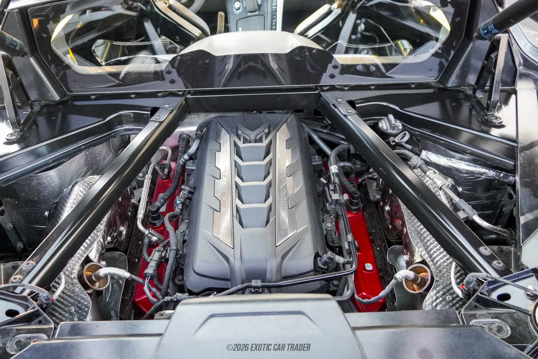 Dressed in Sky Cool Gray, this 2022 Chevrolet Corvette Premium 3LT cuts a fine figure with its Carbon Flash detailing, ceramic coating to protect everything, door edge guards and yellow brake calipers. It’s also got a C8.R-inspired rear spoiler and graphics as part of the limited edition package. You’ve also got quad tailpipes, black wheels and a shape that will turn heads wherever you take it. The Hypersonic Gray interior comes with some yellow accents on the GT2 bucket seats that are powered, heated and ventilated. Then, you’ve got a digital gauge cluster, Apple CarPlay, Android Auto, dual-zone climate control, a Bose Professional Series speaker system and the required active safety features. You’ve also got a multifunction steering wheel with paddle shifters. Regarding cargo, there’s a front trunk as well as a small compartment behind the engine compartment. Combined, you’ve got a similar amount of space as that of a small hatchback. Plus, you can remove the detachable roof panel and enjoy a bit of open-air motoring.