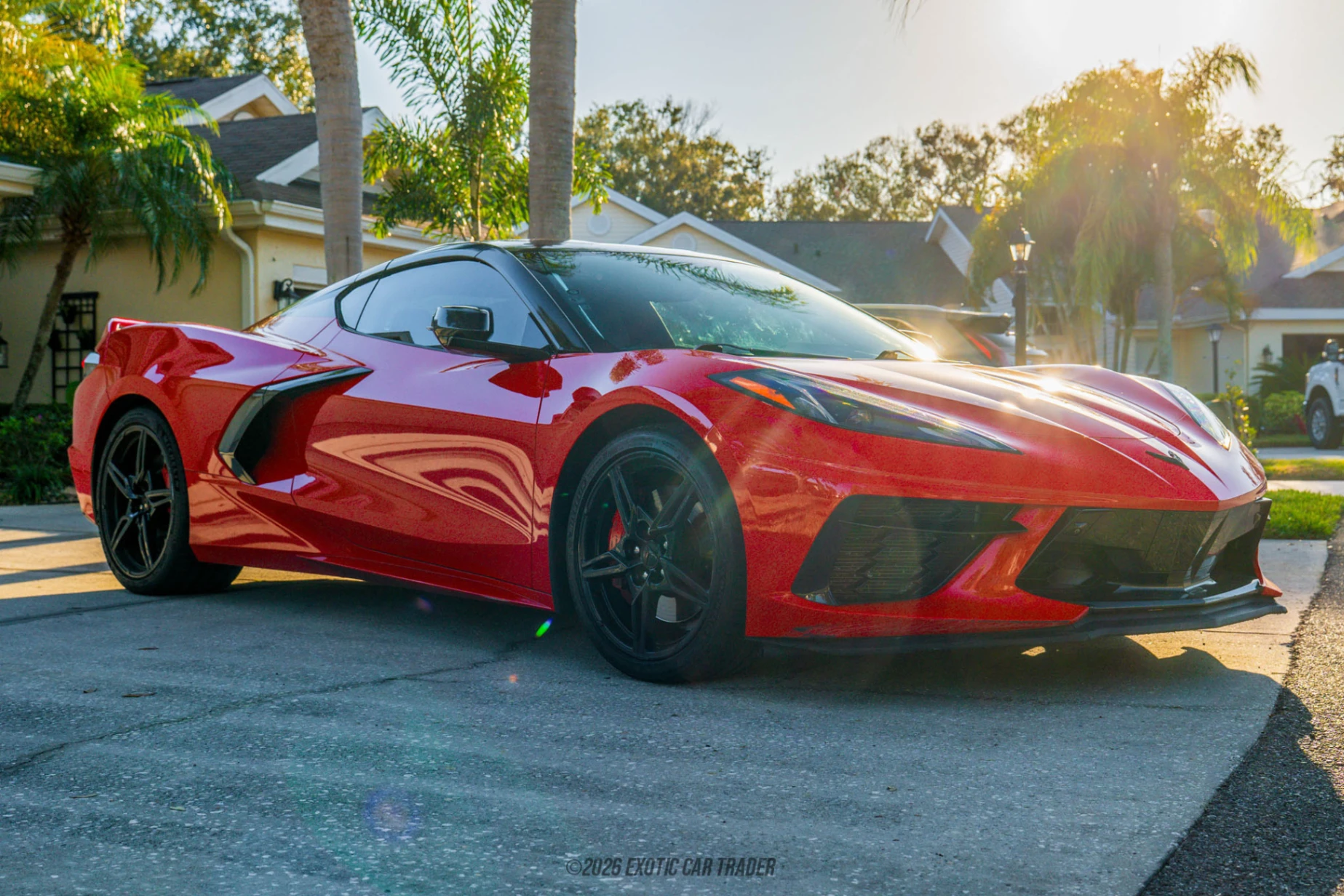 Finished in Torch Red, the exterior of this 2022 Chevrolet Corvette Stingray Coupe 2LT Z51 showcases the C8’s aggressive mid-engine stance with sharp body lines, wide hips, and functional aerodynamic elements. The Z51 performance components add visual purpose, including the rear spoiler and upgraded wheels that emphasize the car’s track-ready intent without appearing overstyled. Inside, the Jet Black cabin reflects a driver-focused cockpit design, highlighted by premium materials, carbon fiber trim accents, and GT2 bucket seats that balance comfort with lateral support. The 2LT package elevates the experience with a head-up display, rear camera mirror, Bose Performance Series audio system, and extensive technology that reinforces the Corvette’s shift toward a more refined, luxury-performance identity.