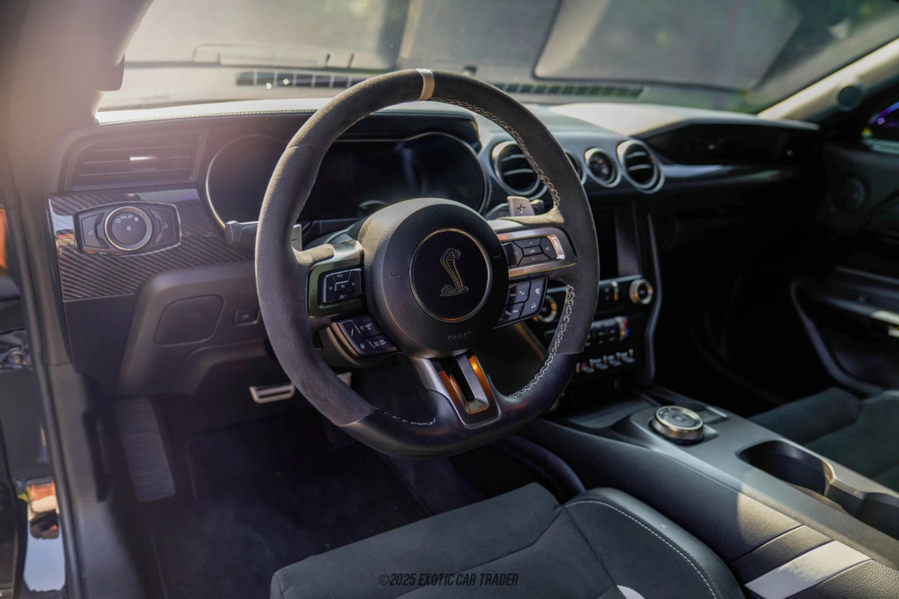 The exterior of this Shelby GT500 is finished in a sleek black that complements its muscular lines and distinctive presence. Signature design elements include exposed carbon fiber detailing, which highlight the vehicle's performance pedigree. The noteworthy braking system, featuring 2-piece vented rotors and Brembo calipers, underscores the car's robust capability. Moving to the interior, the cabin is adorned with Recaro leather-trimmed seats that provide both comfort and support, emphasizing a driver-focused layout. The rich black upholstery extends throughout, creating a cohesive and striking visual appeal. The blend of luxury and performance is further enhanced by the Magneride Damping System, ensuring a refined yet responsive ride at any speed.