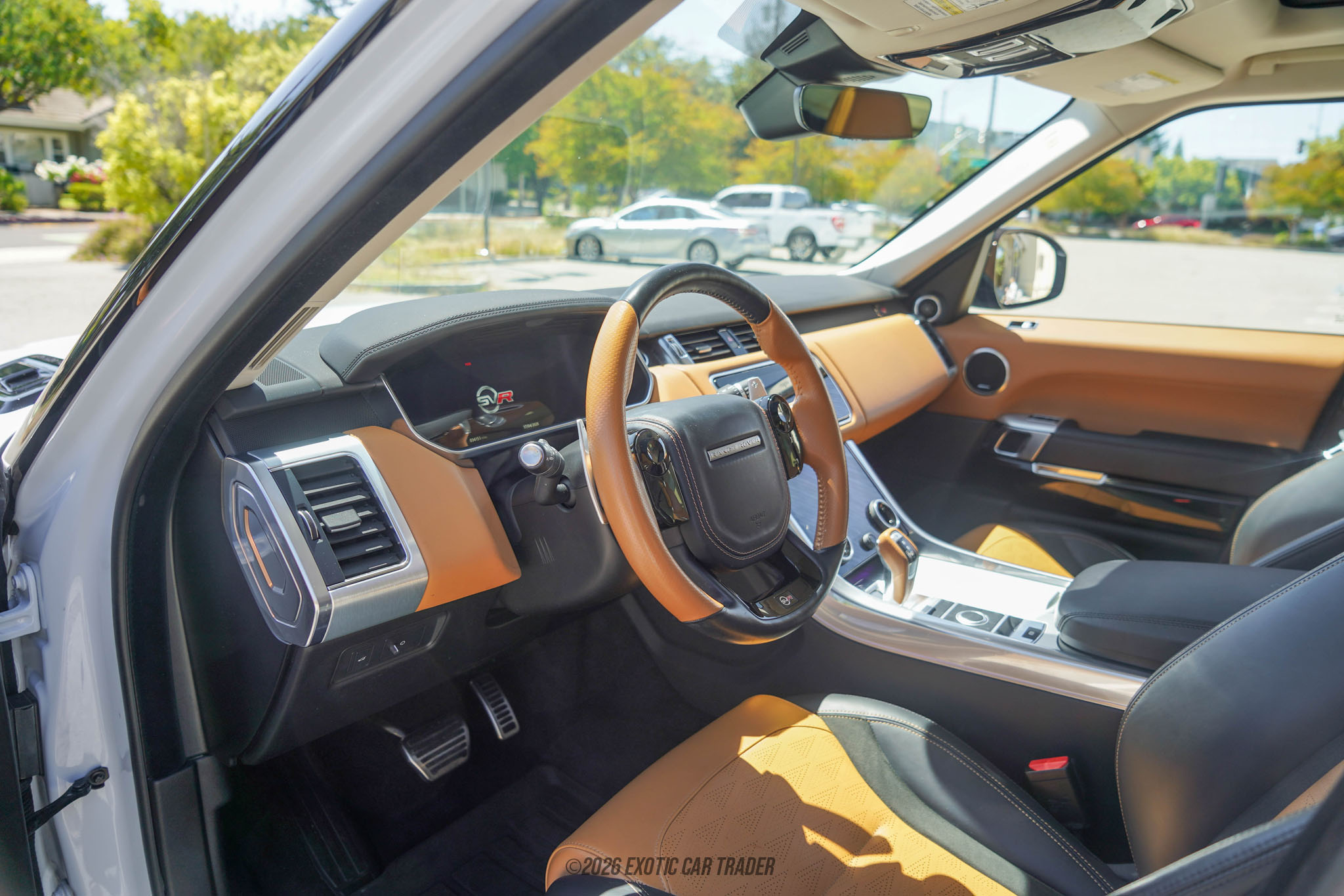 The exterior of this 2022 Land Rover Range Rover Sport SVR is finished in Icy White, a color that contrasts beautifully with the SVR’s aggressive body styling and performance-focused details. Signature SVR elements include a sculpted front fascia with enlarged air intakes, a vented hood, and quad exhaust outlets integrated into the rear diffuser. Sitting on 22-inch Style 5083 split-spoke forged alloy wheels, the stance is both athletic and upscale. The Brembo braking system is tucked behind the wheels, reinforcing its high-performance intent, while subtle SVR badging completes the look. The interior of this 2022 Land Rover Range Rover Sport SVR is upholstered in Ebony and Vintage Tan perforated Windsor leather, offering a premium and sporty cabin environment. SVR performance seats provide excellent bolstering while maintaining long-distance comfort. The Touch Pro Duo infotainment system integrates dual touchscreens for seamless control of navigation, media, and vehicle settings, while the Meridian surround sound system elevates the audio experience. High-end materials, contrasting stitching, and a driver-focused layout make the cabin both luxurious and purposeful.