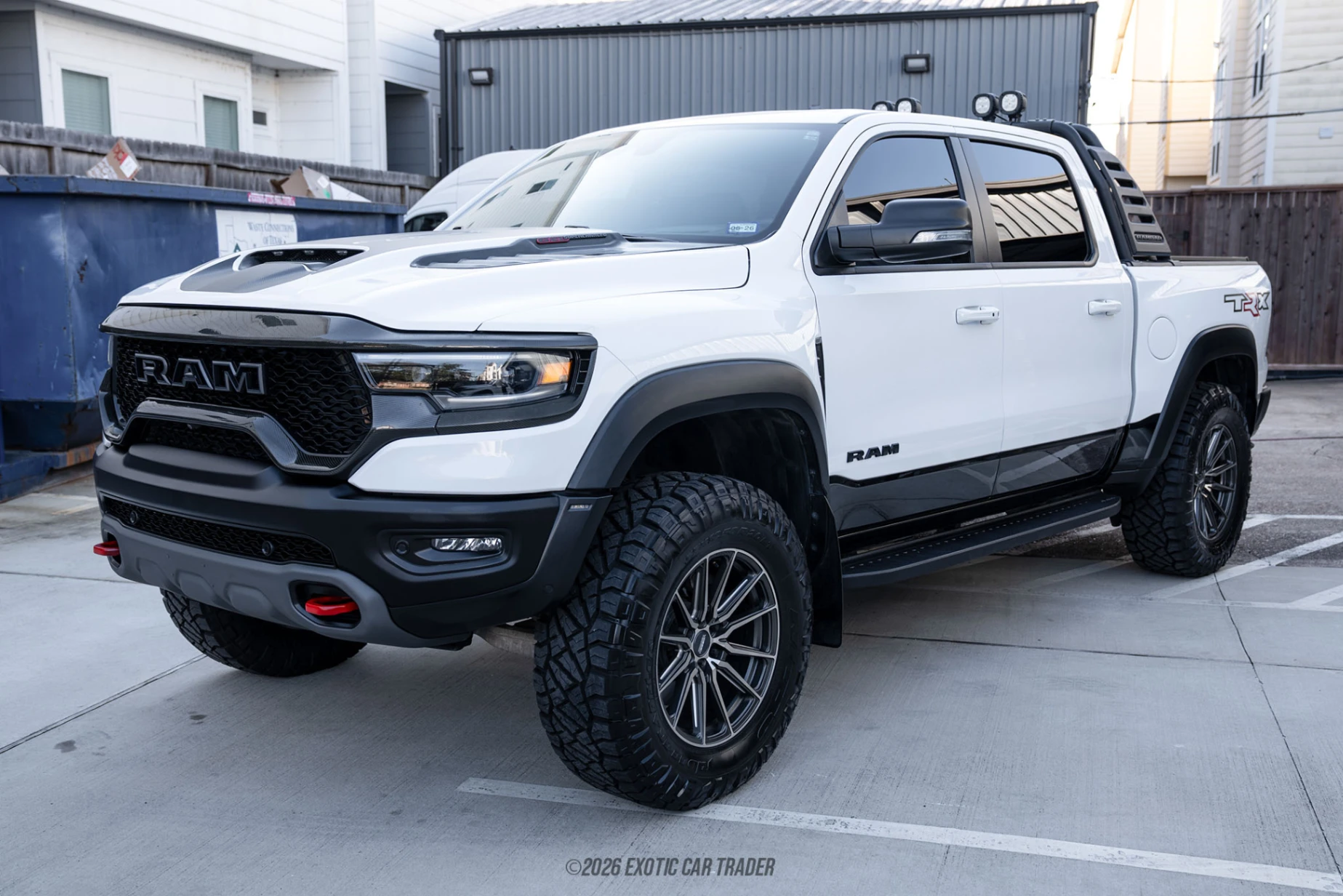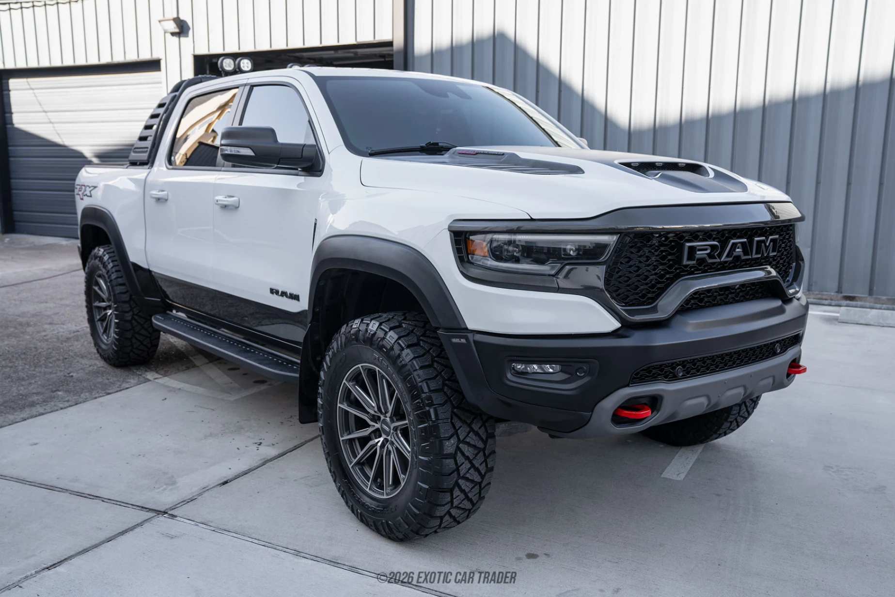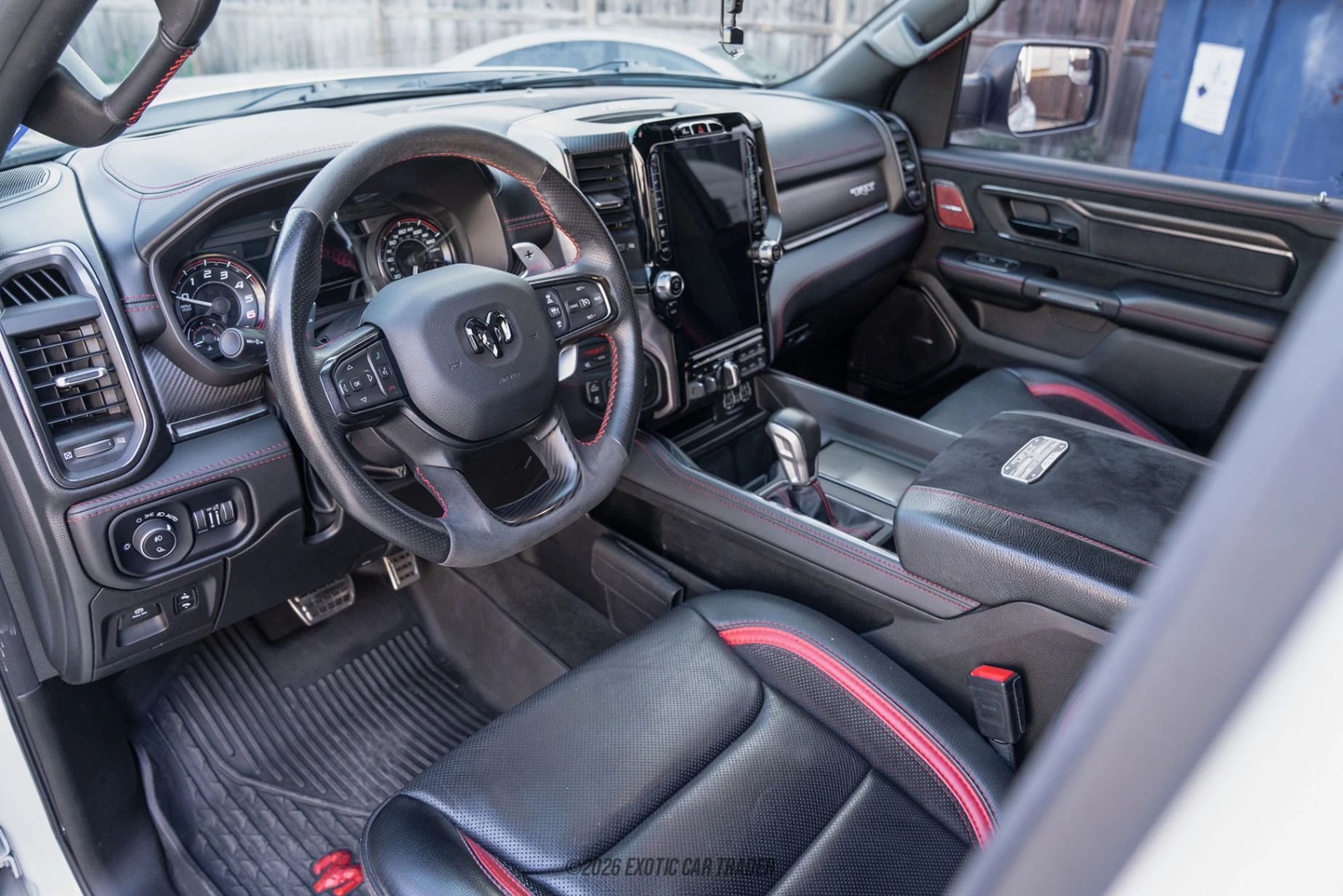 The exterior of this RAM 1500 TRX is finished in Bright White Clear-Coat and features the model’s signature widebody stance, functional hood scoop, and aggressive off-road styling. Factory equipment includes TRX-specific suspension geometry with adaptive Bilstein Black Hawk e² dampers, LED lighting throughout, Mopar exterior graphics, bed-mounted spare tire carrier, power running boards, trailer brake controller, and a power tailgate with release. The interior of this TRX is trimmed in leather with carbon fiber accents and is exceptionally well equipped from the factory. Highlights include heated and ventilated front seats, heated rear seats, heated steering wheel, head-up display, digital rearview mirror, Harman Kardon premium audio system, navigation, wireless charging, memory seating, and dual-zone climate control. The cabin blends luxury-grade materials with TRX-exclusive detailing, delivering comfort without sacrificing the truck’s performance-focused character.
