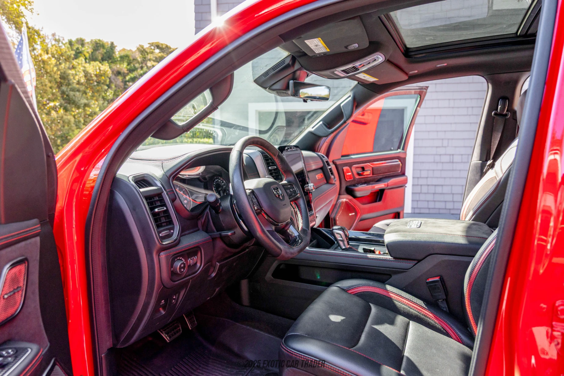 This eye-catching 2022 RAM 1500 TRX 4x4 with lower two-tone paint will fit your daily needs perfectly if you don't mind your daily car standing out from the crowd. The exterior is fully coated with ceramic paint, leaving your mind at peace as you traverse through the beaten path. This RAM can rule these paths with ease, given that it is fitted with Mickey Thompson high-traction tires and 20" Rock Star alloy wheels. It looks good while doing so, thanks to the "TRX" Mopar® graphics adorning its exterior. Adding to the functionality of this already capable truck are black power-fold trailer-tow mirrors, a power-operated tonneau cover, and the panoramic sunroof. As previously noted, the cabin of the 2022 RAM 1500 TRX 4x4 is crafted from soft-touch, high-quality materials, making it an appealing daily driver. It is luxurious too, accented with “TRX” red stitching and carbon fiber trim panels. Thanks to the TRX Level 2 Equipment Group and Customer Preferred Package 29Y, you also get elevated comfort and technology experience. Meanwhile, the Advanced Tazer Security System ensures your vehicle's safety.