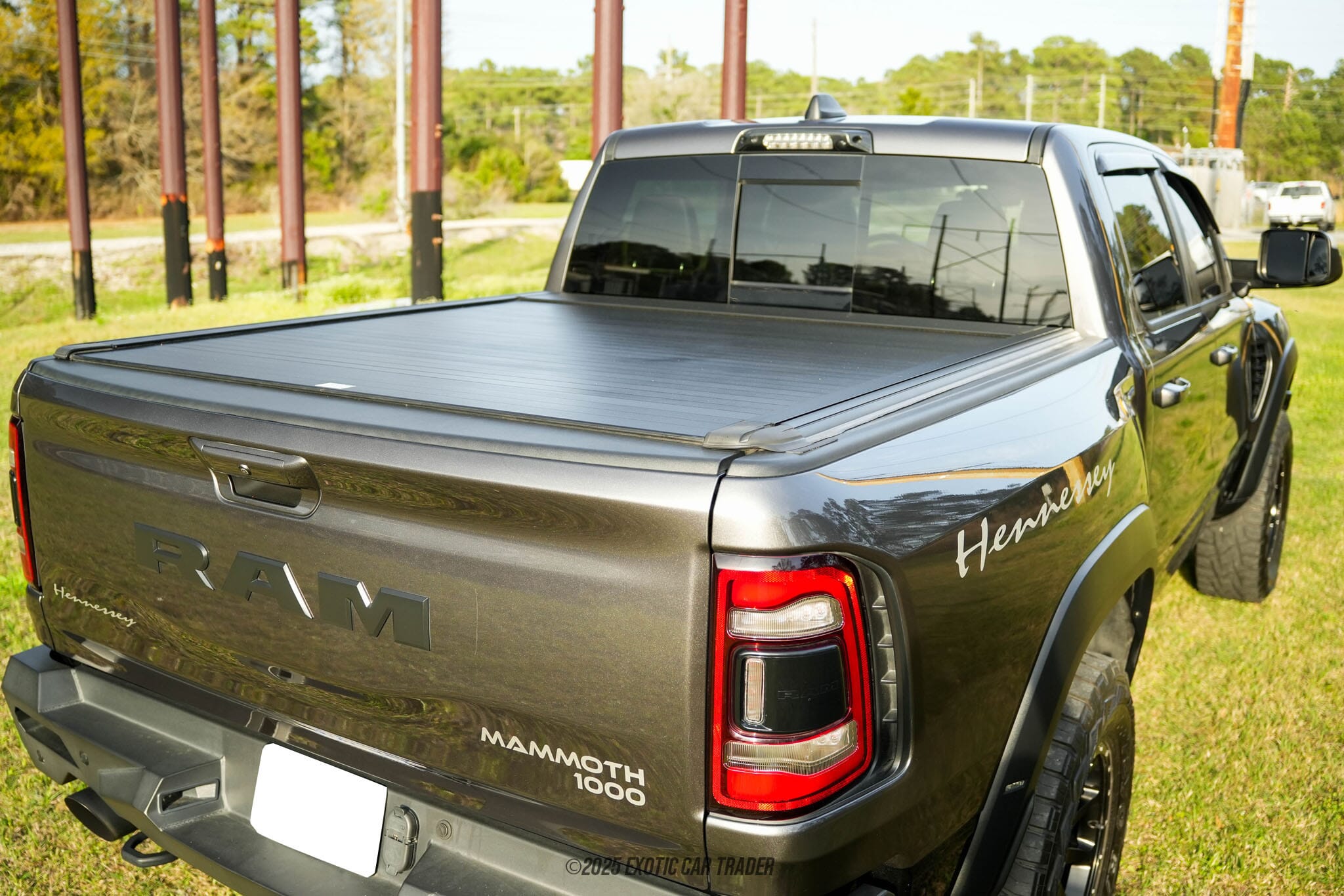 The seller describes the exterior of this Mammoth 1000 as finished in a sleek grey, exuding both sophistication and aggression. The MAMMOTH™ Custom Front and Rear Bumpers not only enhance the truck's rugged appearance but also incorporate functional LED lighting, providing improved visibility and a distinctive look. The 20-inch Hennessey® 10-Spoke Wheels add to the vehicle's formidable presence on the road. Inside, the cabin features black upholstery, with Hennessey® Embroidered Headrests adding a touch of exclusivity. MAMMOTH™ 1000 Exterior Badging further distinguishes this truck as a unique specimen in the realm of high-performance pickups.