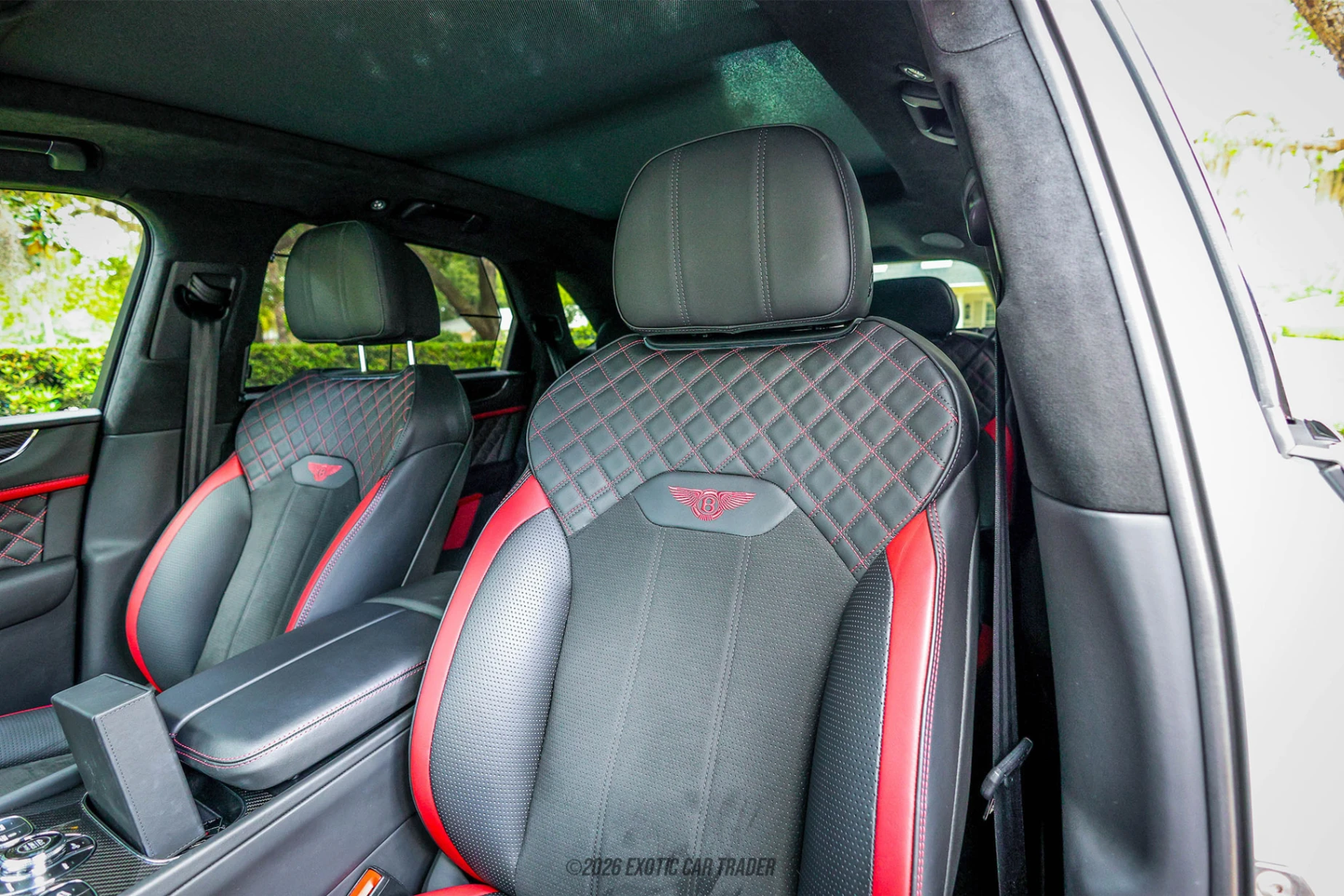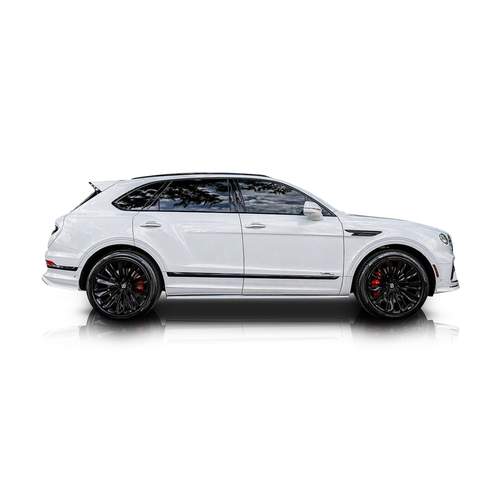 The exterior of this 2023 Bentley Bentayga Speed is finished in Artica, a clean and timeless solid white that highlights the SUV’s muscular proportions and refined design language. The Blackline Specification replaces traditional chrome accents with gloss black trim, giving the vehicle a more contemporary and performance-oriented presence. Sitting on 22-inch black-painted Speed wheels, this Bentayga carries an assertive stance, while subtle details like LED welcome lamps enhance the ownership experience. The inclusion of a fixed tow bar adds an extra layer of versatility without compromising its upscale appeal. The interior of this 2023 Bentley Bentayga Speed is a stunning combination of Beluga and Hotspur, blending deep black tones with rich red accents for a sporty yet luxurious atmosphere. Carbon fibre trim across the fascia, console, and doors reinforces the Speed model’s performance character, while contrast stitching and contrast-bound overmats showcase Bentley’s attention to detail. The Front Seat Comfort Specification ensures maximum adjustability, heating, and support, while the heated, indented steering wheel adds tactile refinement. Every surface reflects Bentley’s craftsmanship, making the cabin both a driver-focused environment and a first-class lounge.